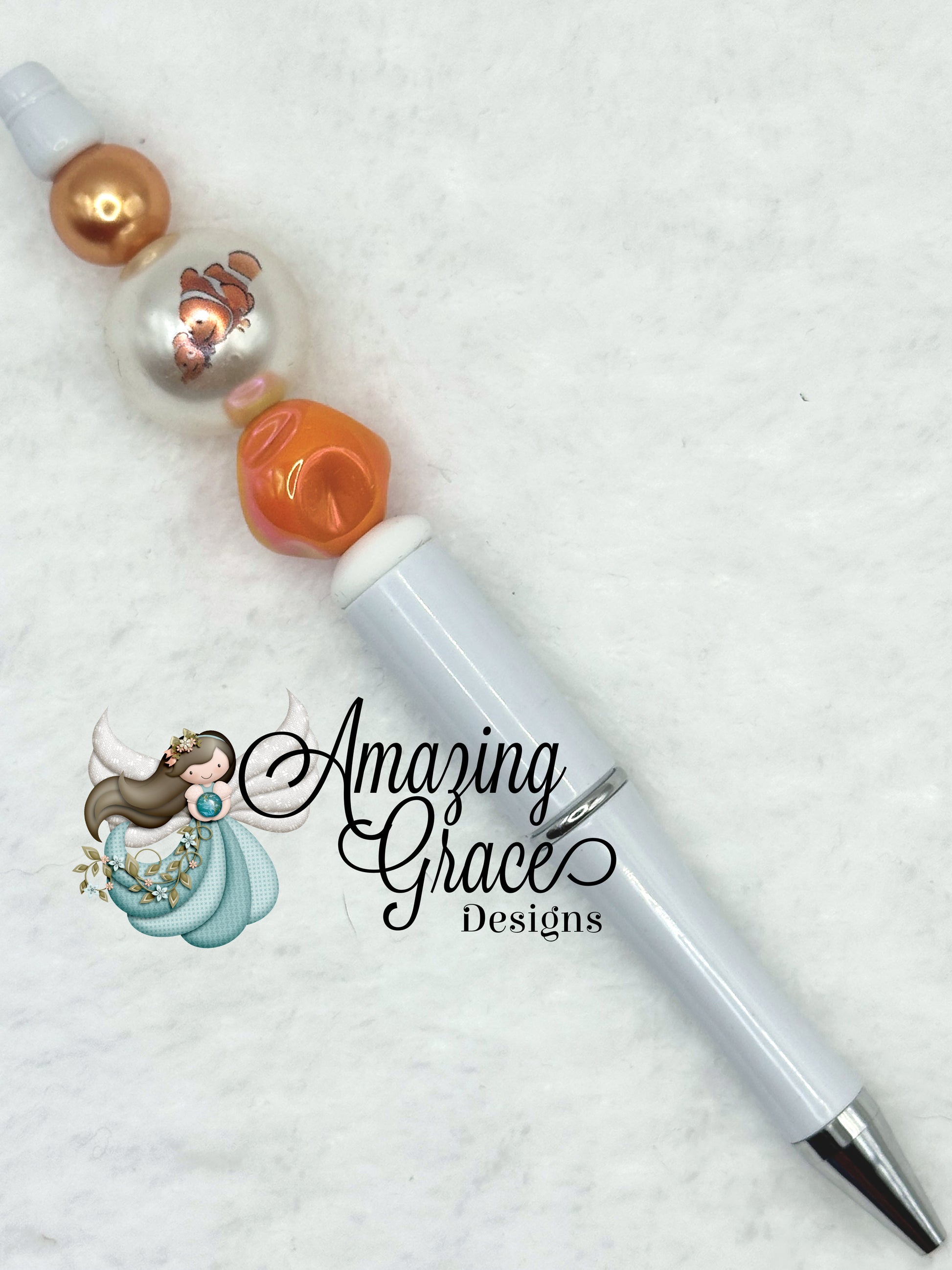 Dive into your writing with this charming beaded pen, featuring a playful orange and white fish design nestled within a clear bead. Accented with warm bronze and vibrant orange beads, and topped with a sleek white barrel, it's a delightful way to add oceanic charm to your desk.