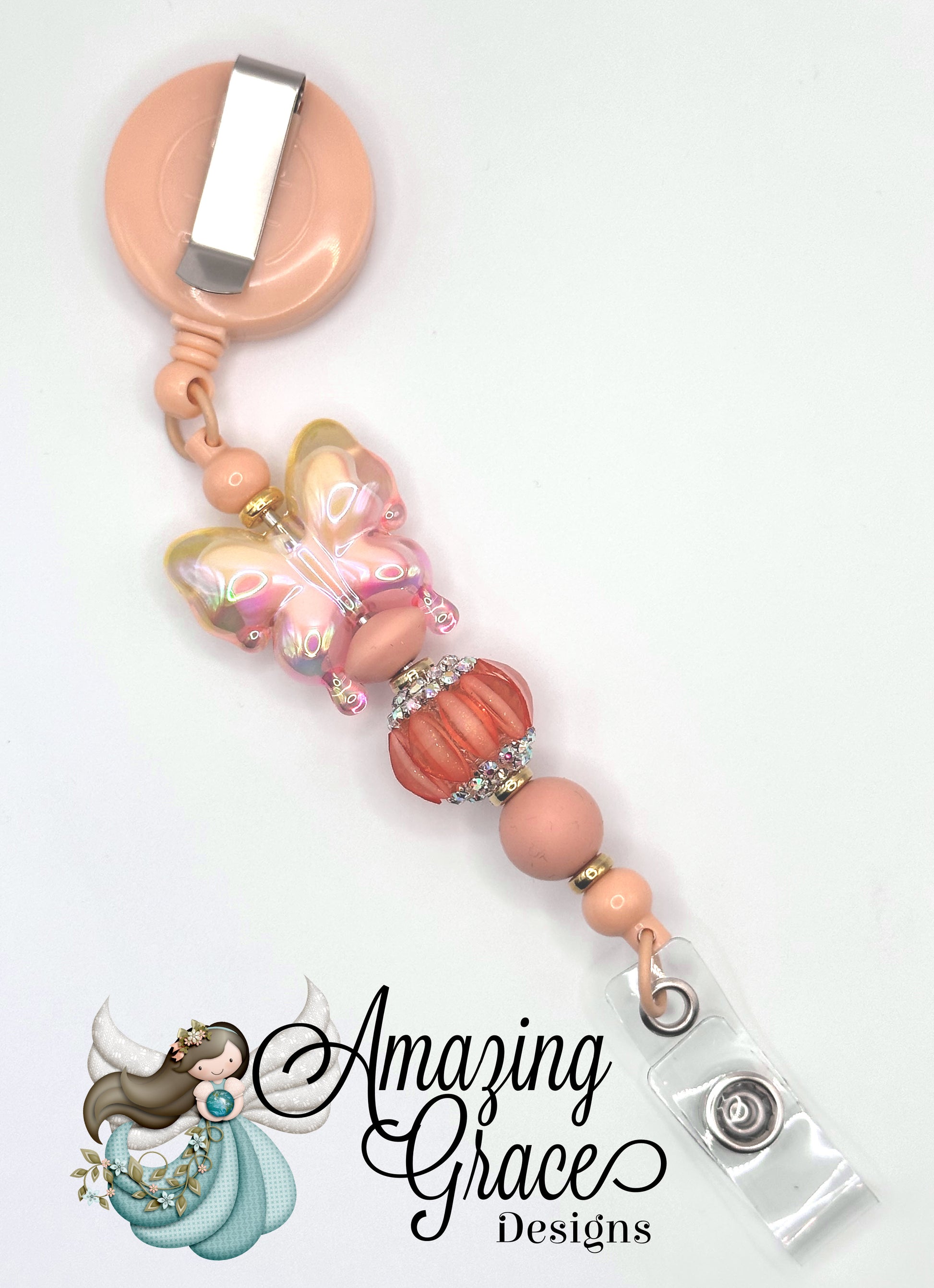 Add a touch of elegance and charm to your workday with this stunning beaded retractable badge reel. Featuring a beautiful iridescent coral butterfly, complemented by various blush and peach-toned beads, including one adorned with sparkling rhinestones. This eye-catching accessory is perfect for nurses, teachers, office professionals, or anyone looking to add a feminine and stylish flair to their ID badge.