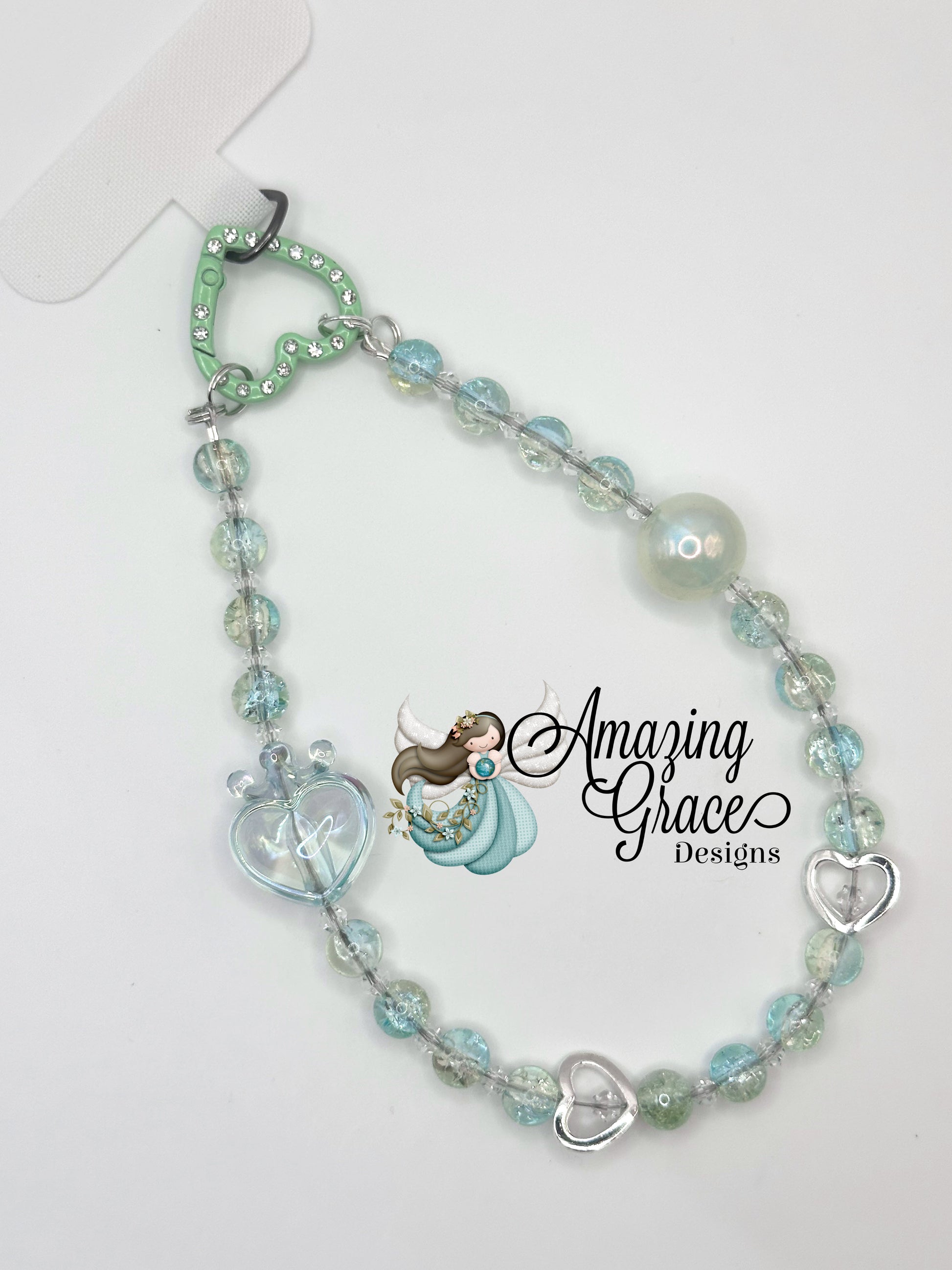 Elevate your phone's style and security with this charming wristlet, crafted with a mix of shimmering glass and lightweight acrylic beads. Featuring delicate silver heart accents and a clear heart charm this wristlet ensures your phone stays close while adding a touch of personalized elegance. Includes a convenient tether attachment for easy use.