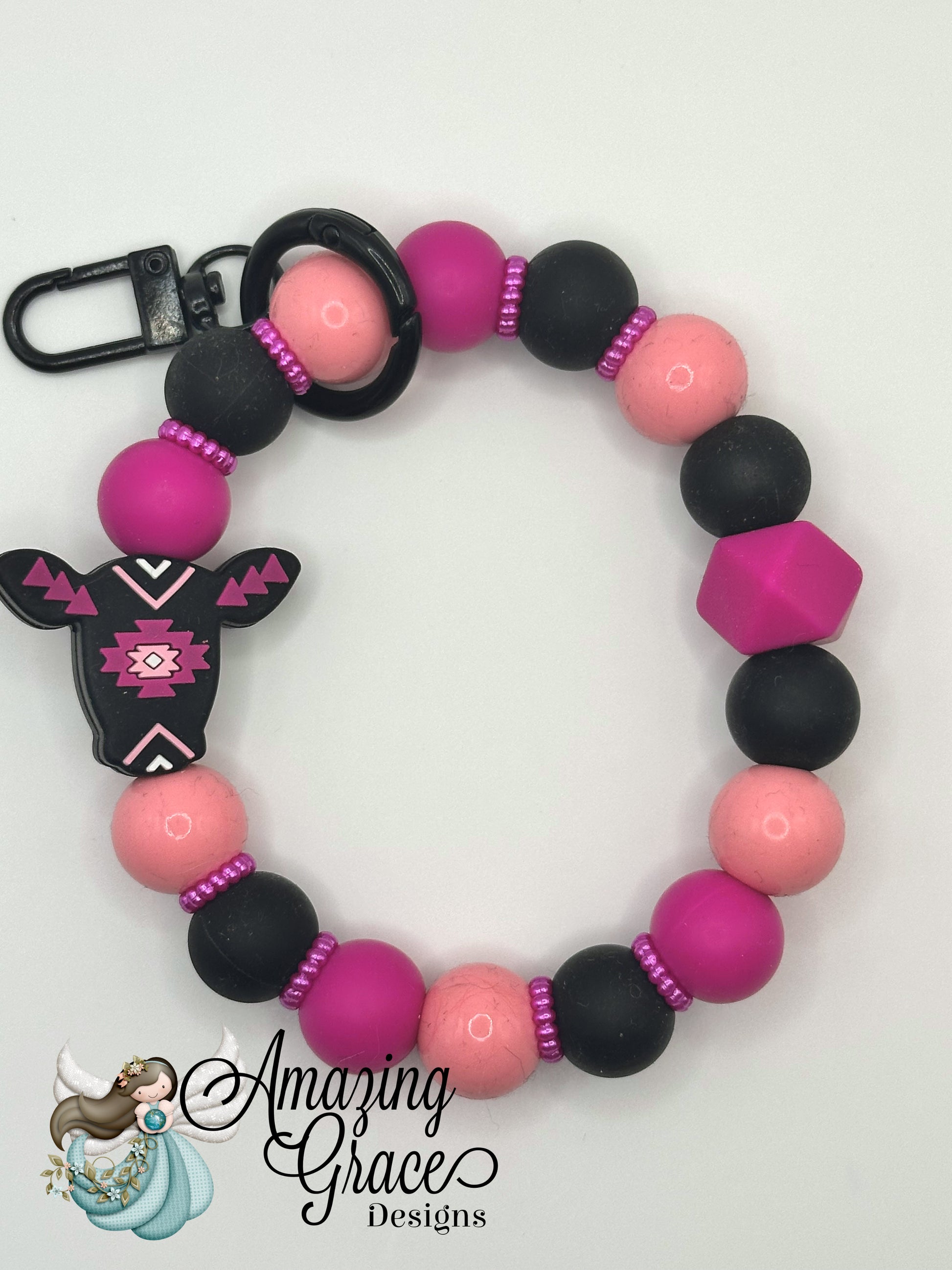 Embrace your Western flair with this stylish keychain wristlet. The design showcases a striking steer head charm featuring a pink and black Aztec pattern. The beaded bracelet combines matte black, hot pink, and marbled light pink beads with sparkly spacers, all held together by a durable black clasp and keyring.