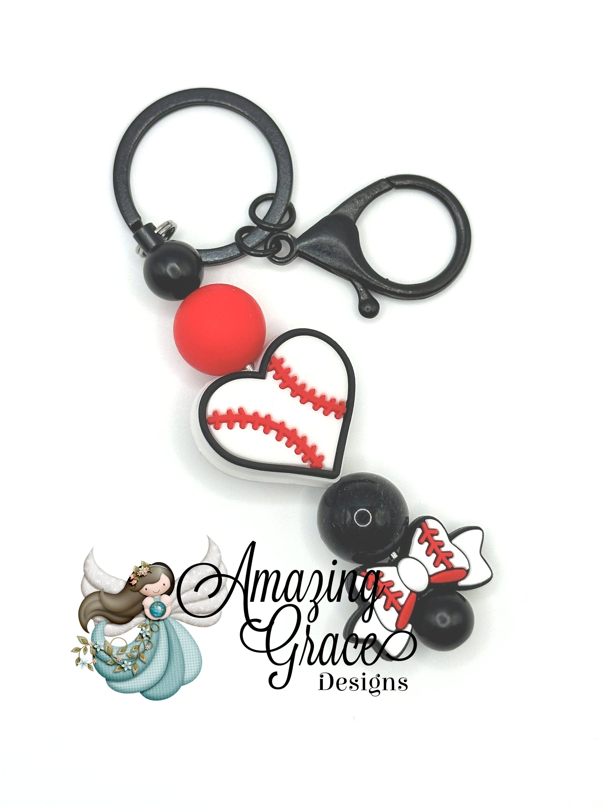 Express your love for the game with this striking baseball-themed keychain and bag charm! This spirited accessory features bold red and sleek black beads, beautifully framing a classic baseball heart charm. It's perfectly complemented by a charming baseball-stitched bow, adding an extra touch of team spirit. The durable black key ring and carabiner clip ensure easy attachment to keys, sports bags, backpacks, or purses, making it the ideal way to celebrate your passion for baseball in style!