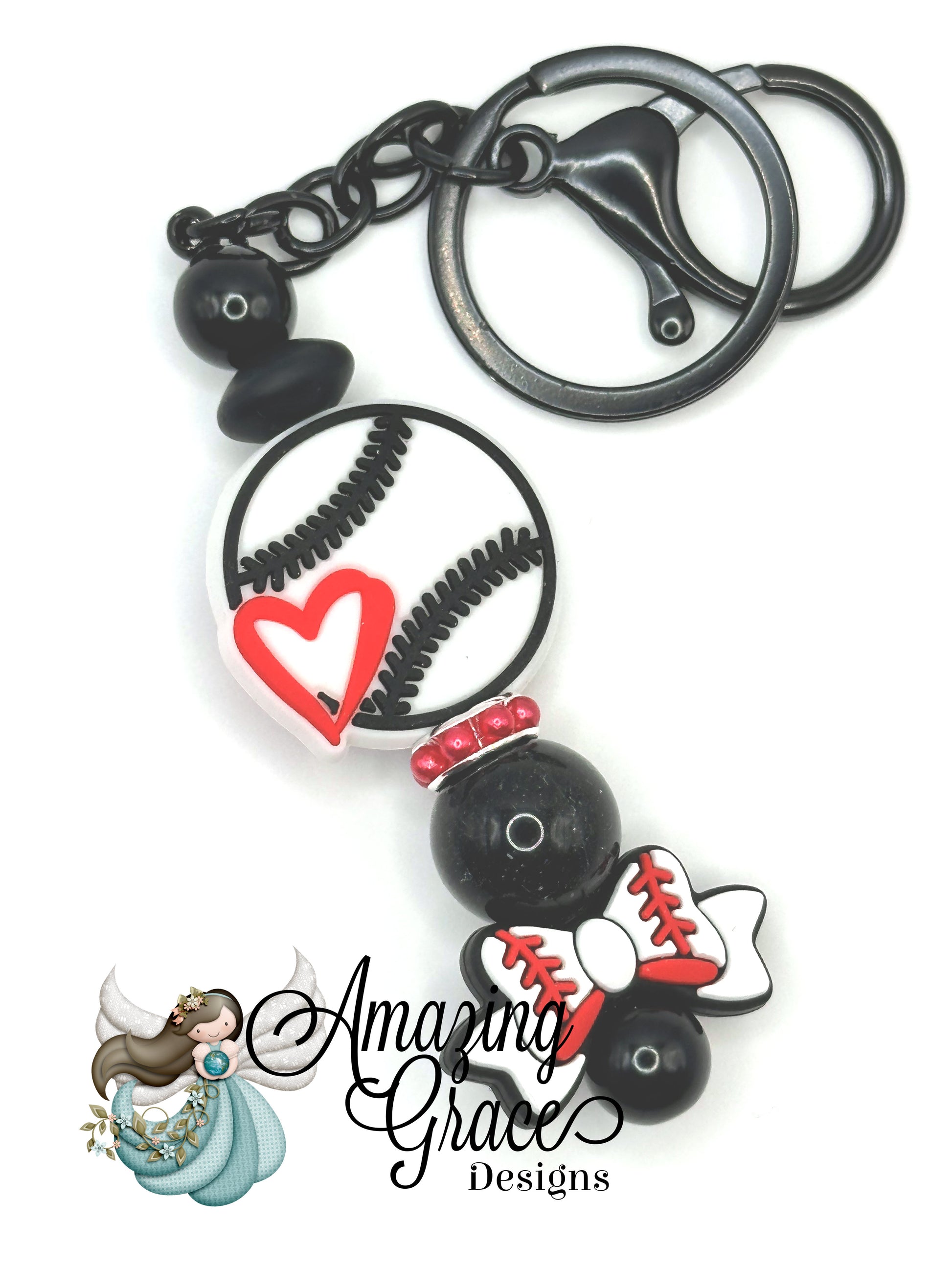 Step up your fan game with this dynamic baseball-themed keychain and bag charm! This spirited accessory features sleek black beads, a classic white baseball charm with a bold red heart, and a charming white bow with red stitching detail. The durable black key ring and carabiner clip ensure easy attachment to keys, sports bags, backpacks, or purses, making it the perfect way to display your passion for the diamond in style!