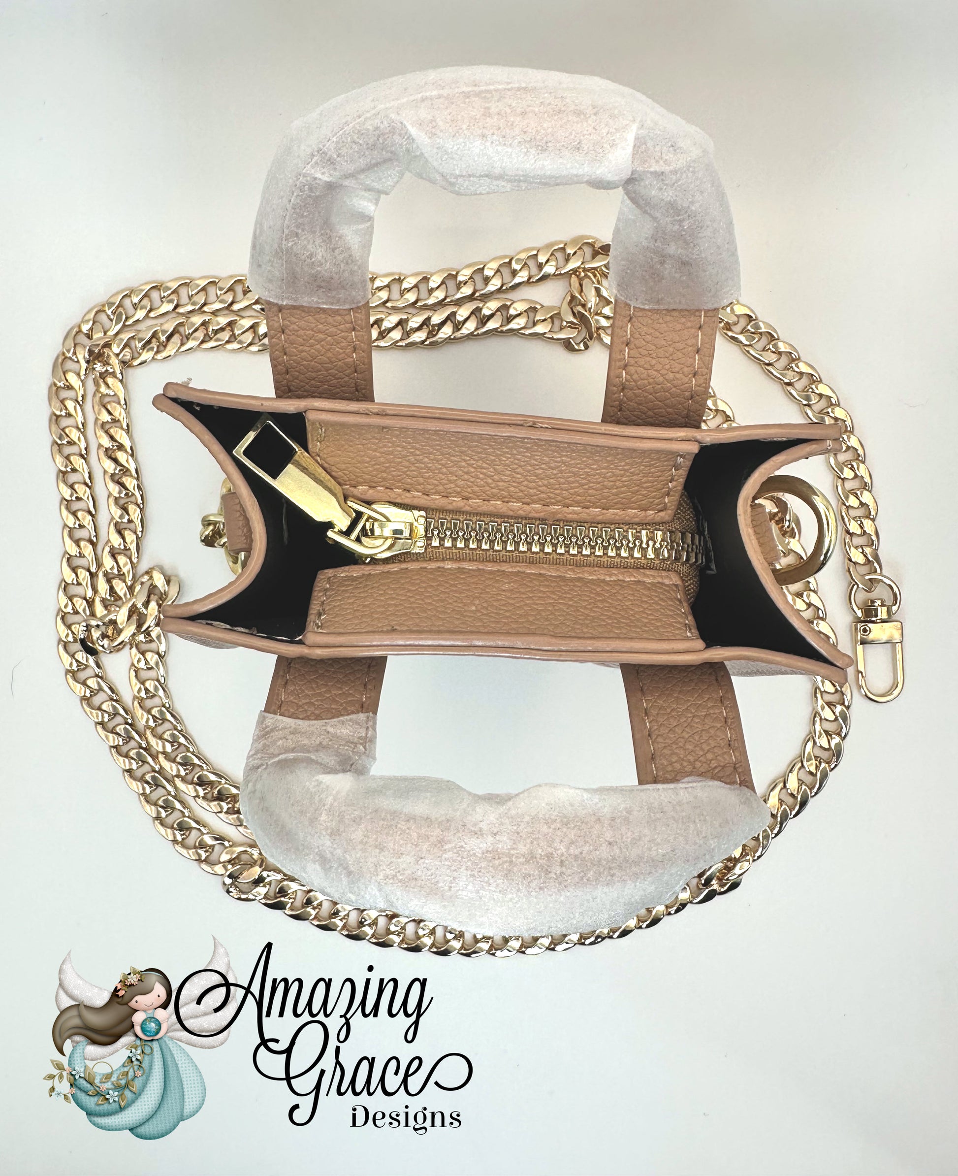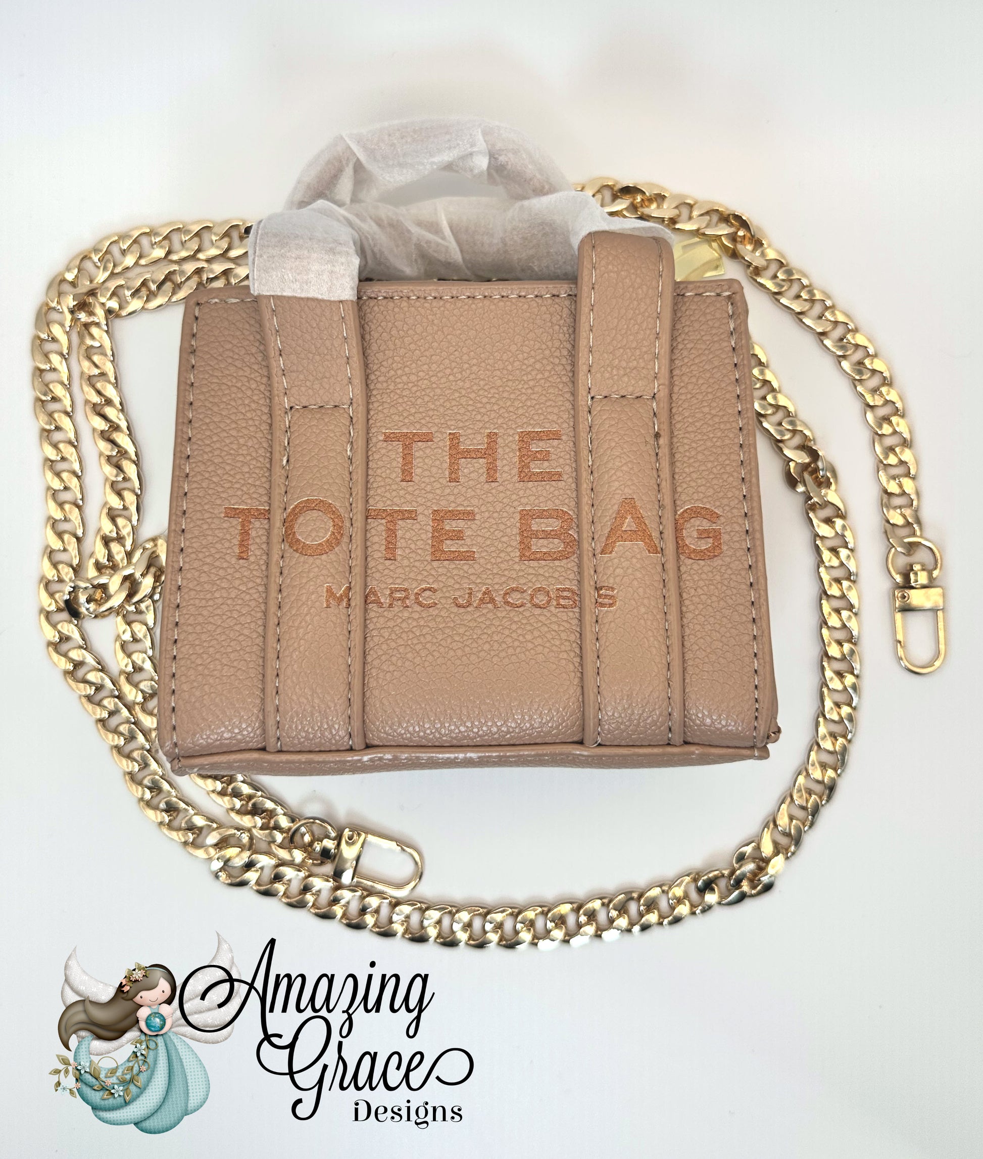 Beige Mini Faux Leather Tote with Detachable Gold Chain