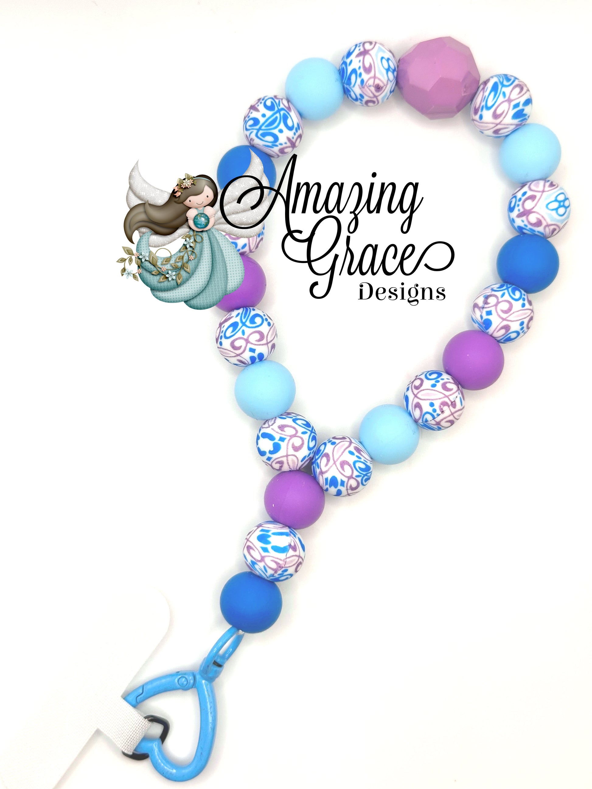 Elevate your everyday style with this mesmerizing silicone wristlet! It features a captivating mix of solid blue, light blue, and purple beads, interspersed with beads boasting an intricate white and blue swirl pattern. Perfect for keeping your phone, keys, or other essentials securely on your wrist while you're on the go. Please note: Cellphone case is NOT included.
