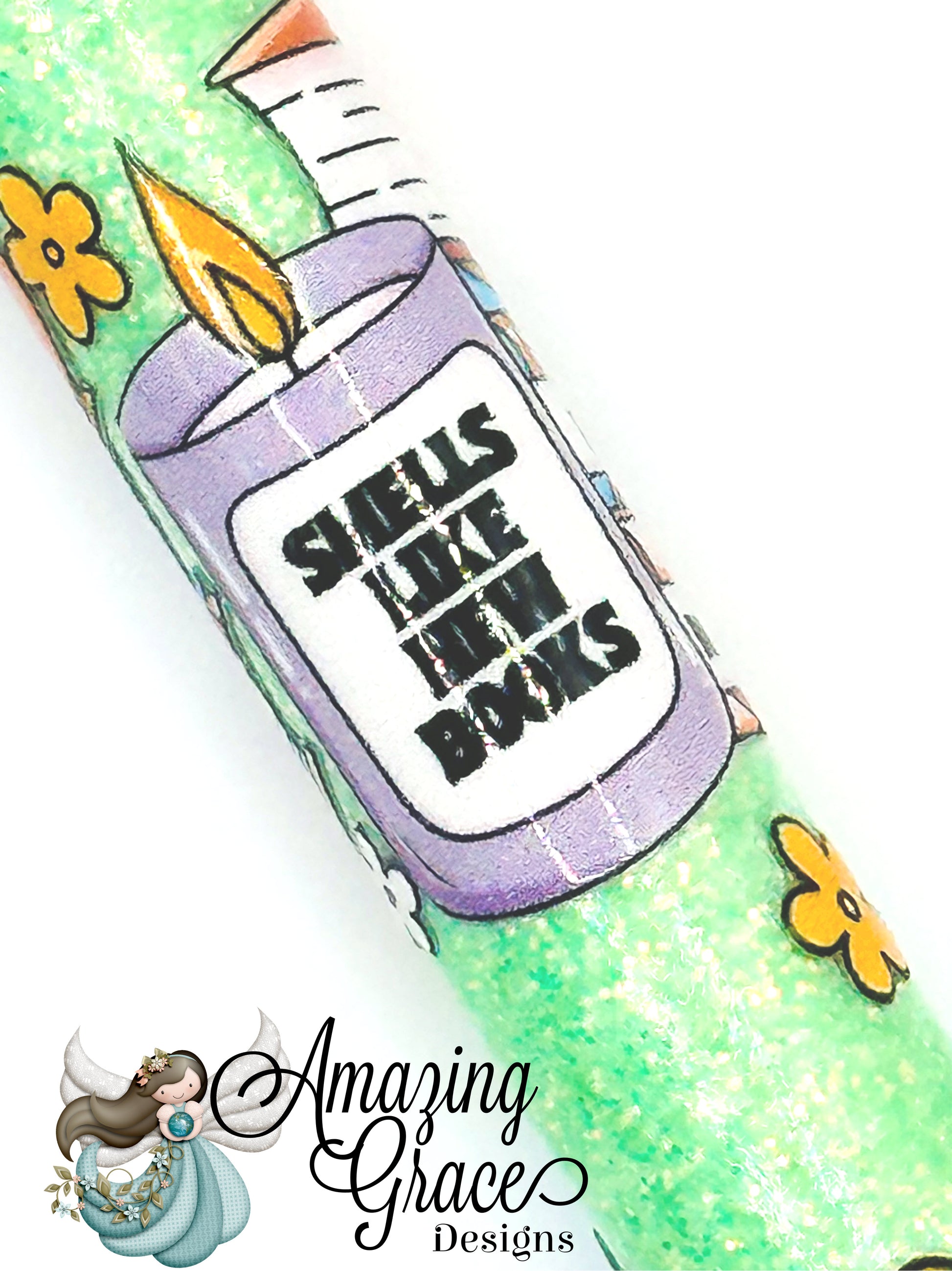 Perfect for any bookworm, this pen celebrates the joy of reading. This high-quality ballpoint pen is decorated with a durable UVDTF wrap featuring a beautiful light green. The design includes reading-themed icons such as a "Smells Like New Books" candle and the relatable phrase, "I'll Just Read One More Chapter". Finished with elegant silver accents, this pen writes with smooth black ink and is a stylish and functional accessory for note-taking, journaling, or writing your own story.