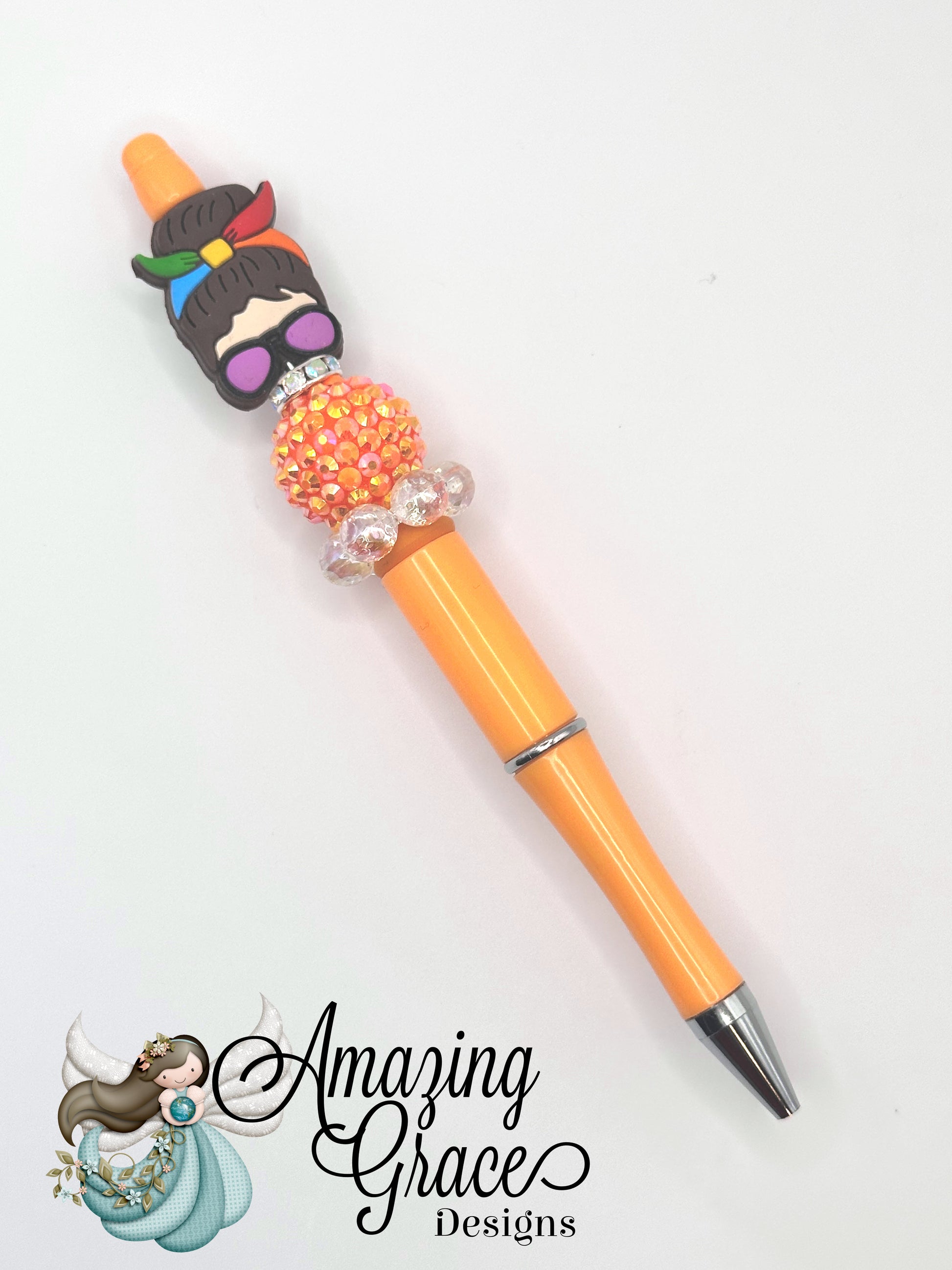 A fun and stylish pen for any busy mom. This beautiful orange pen features a silicone "Busy Mom Life" focal with a messy bun and sunglasses. The textured orange and clear iridescent beads complete the look.