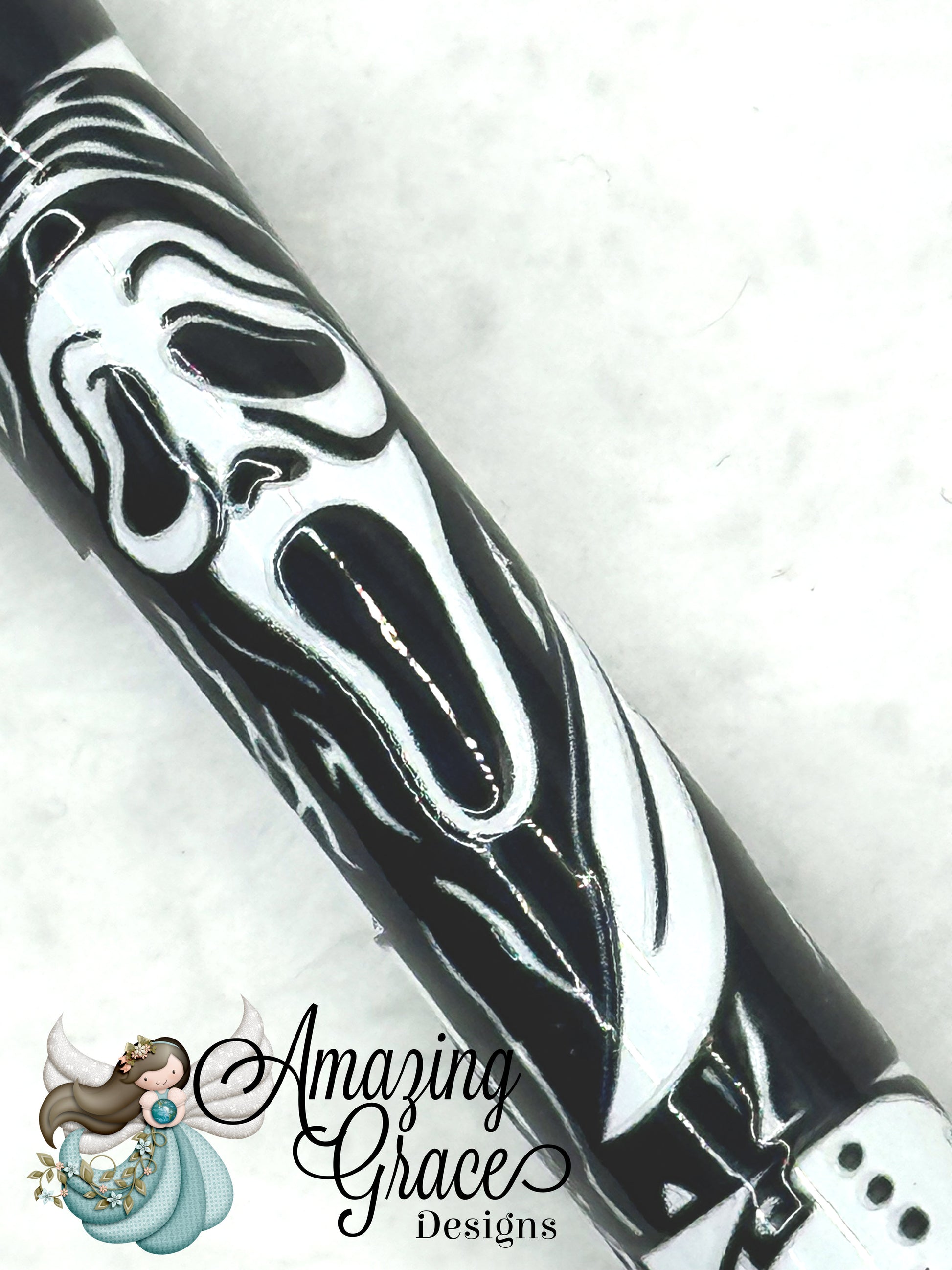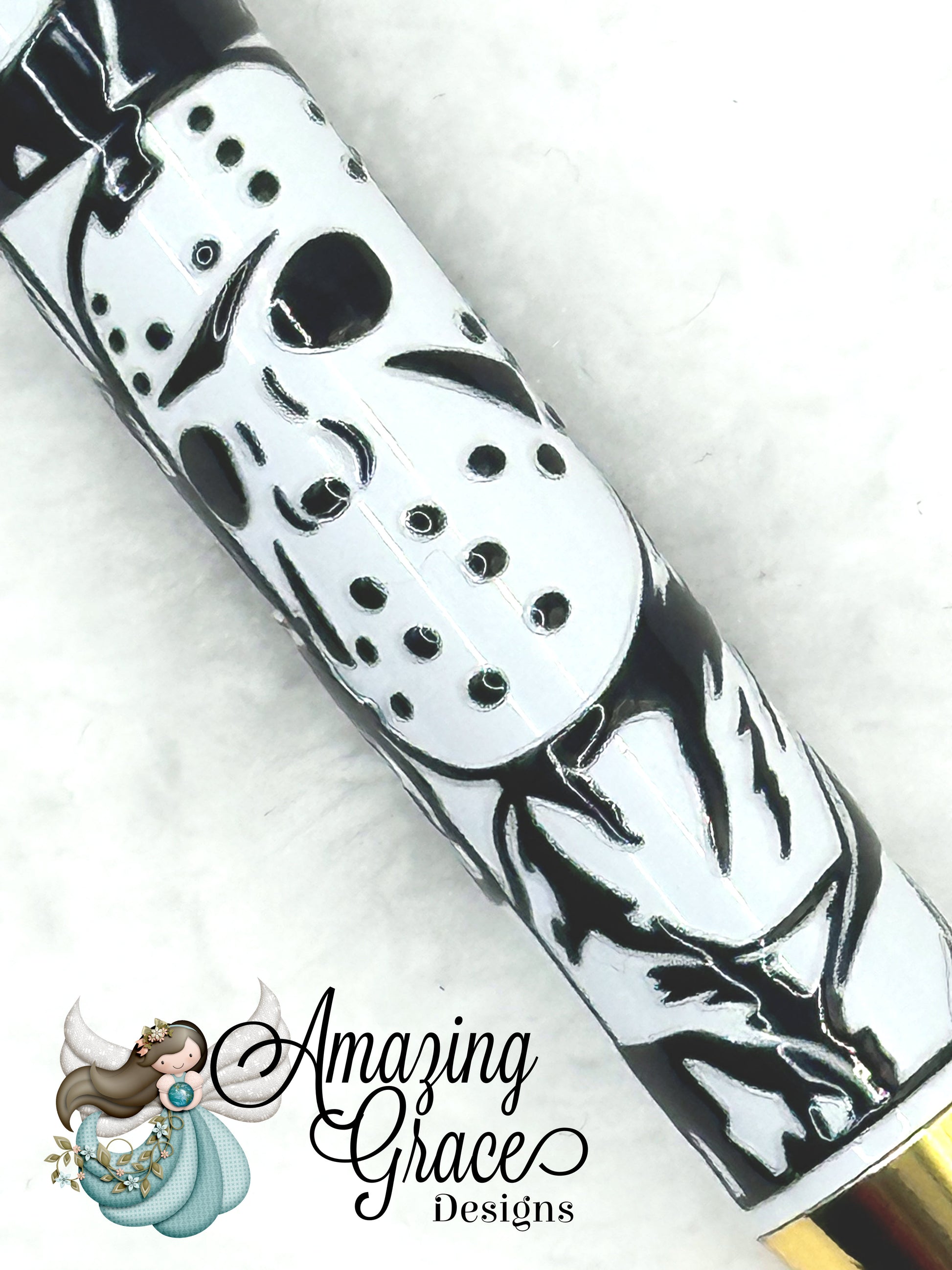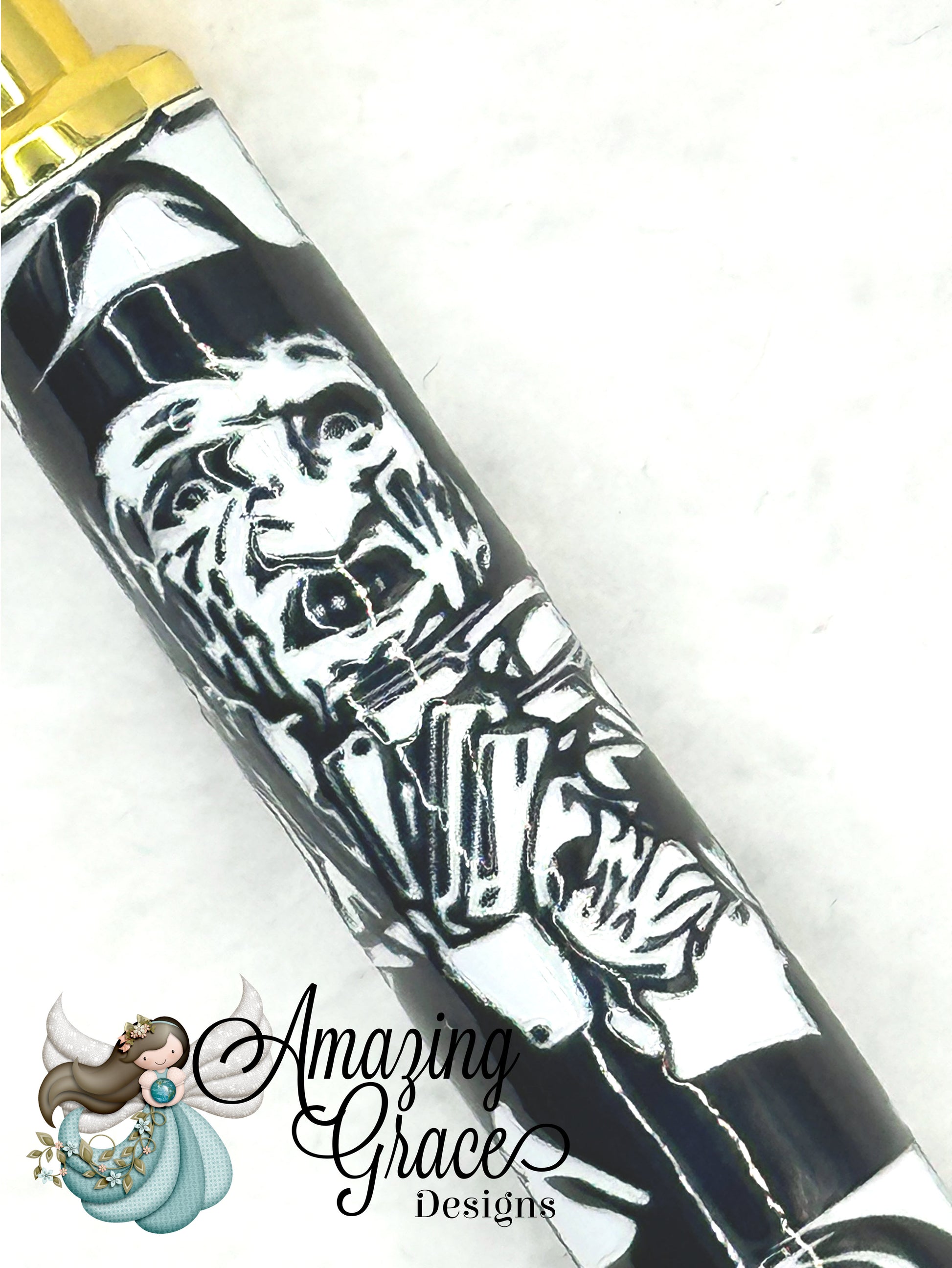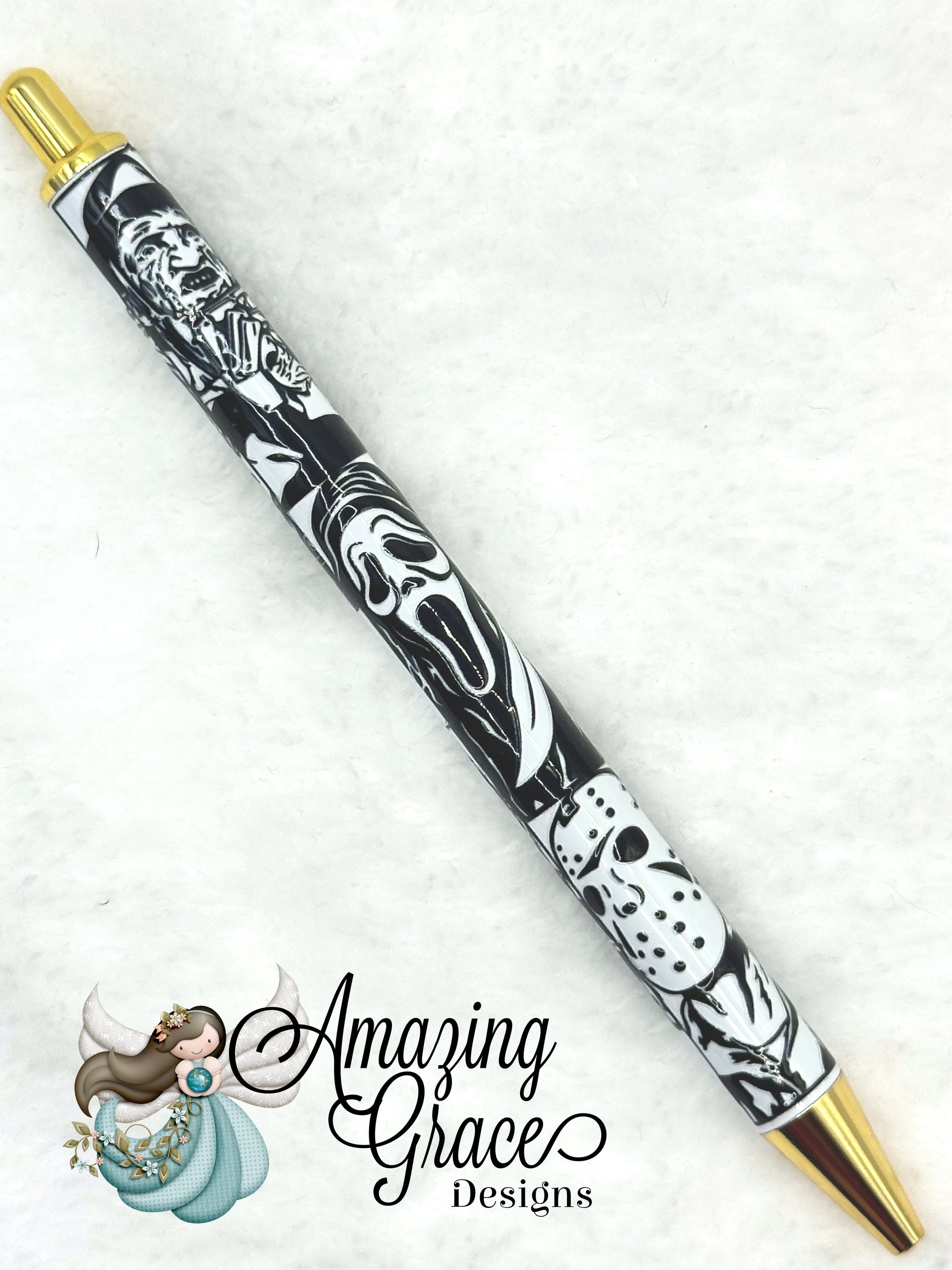 This white pen features a bold black and white design showcasing iconic, recognizable faces from classic horror films. A chilling yet stylish accessory for fans of the genre, this pen adds a touch of spooky flair to your everyday writing. Accented with gold tips for a touch of contrast.