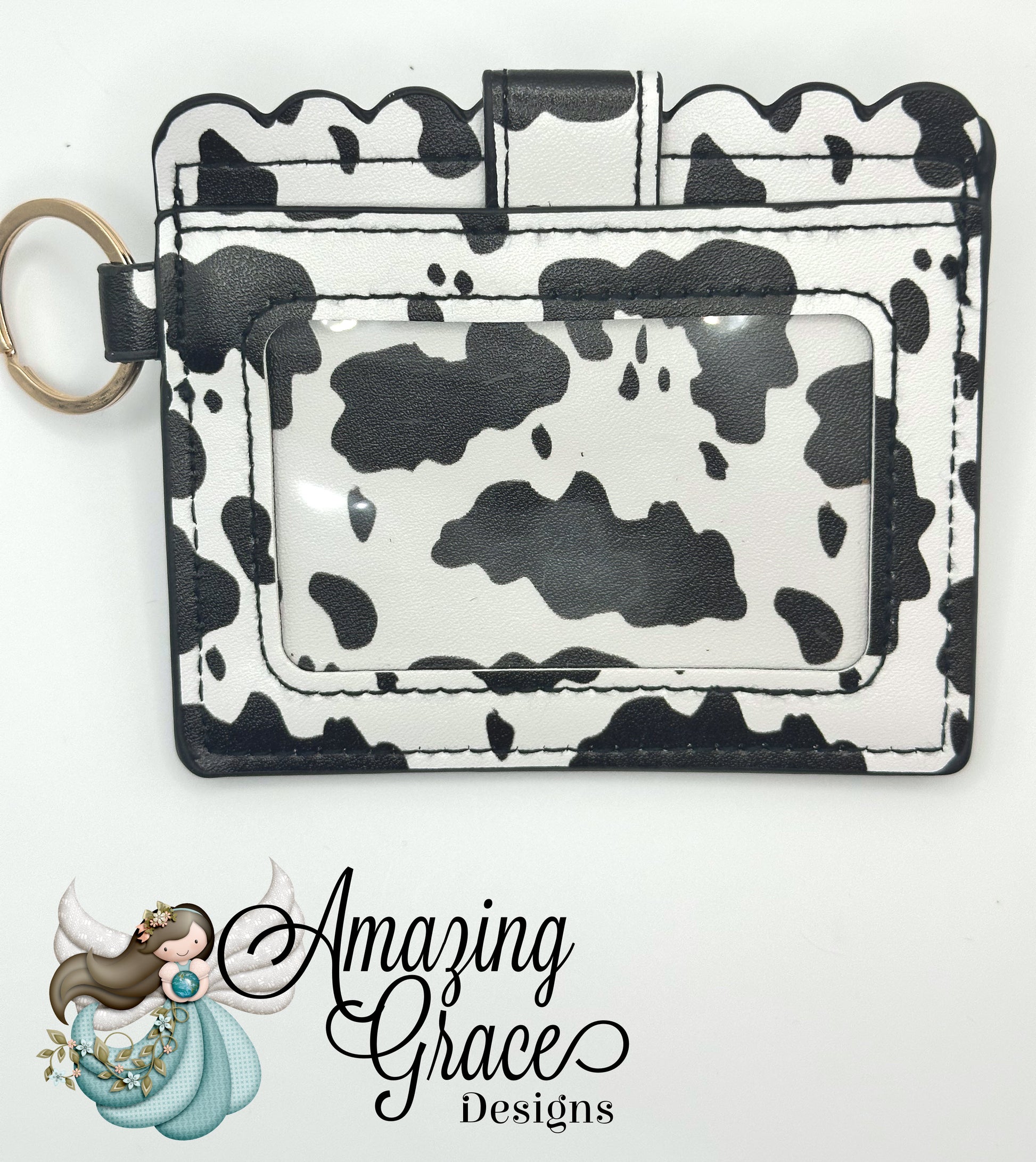 Keep your essentials organized in style with this adorable cow print card holder. Featuring a fun black and white cowhide pattern, this wallet is perfect for those who love a rustic, Western-inspired aesthetic. The front has multiple card slots with a scalloped edge and a secure snap closure, while the back includes a clear ID window. It also comes with a convenient keyring, allowing you to attach it to your keys, bag, or lanyard for easy access. This compact and practical accessory is a must-have for keeping your cards and ID safe and accessible.