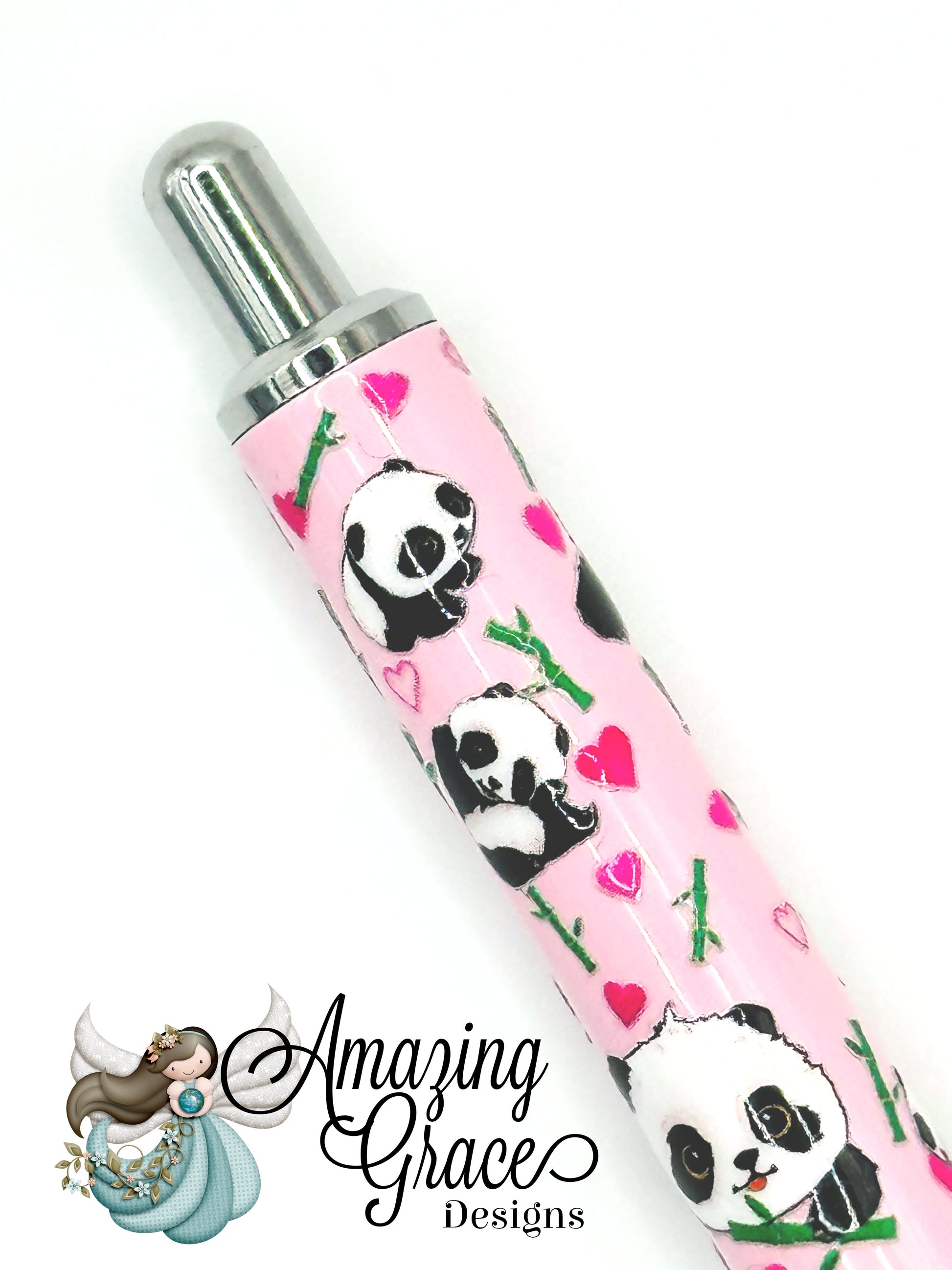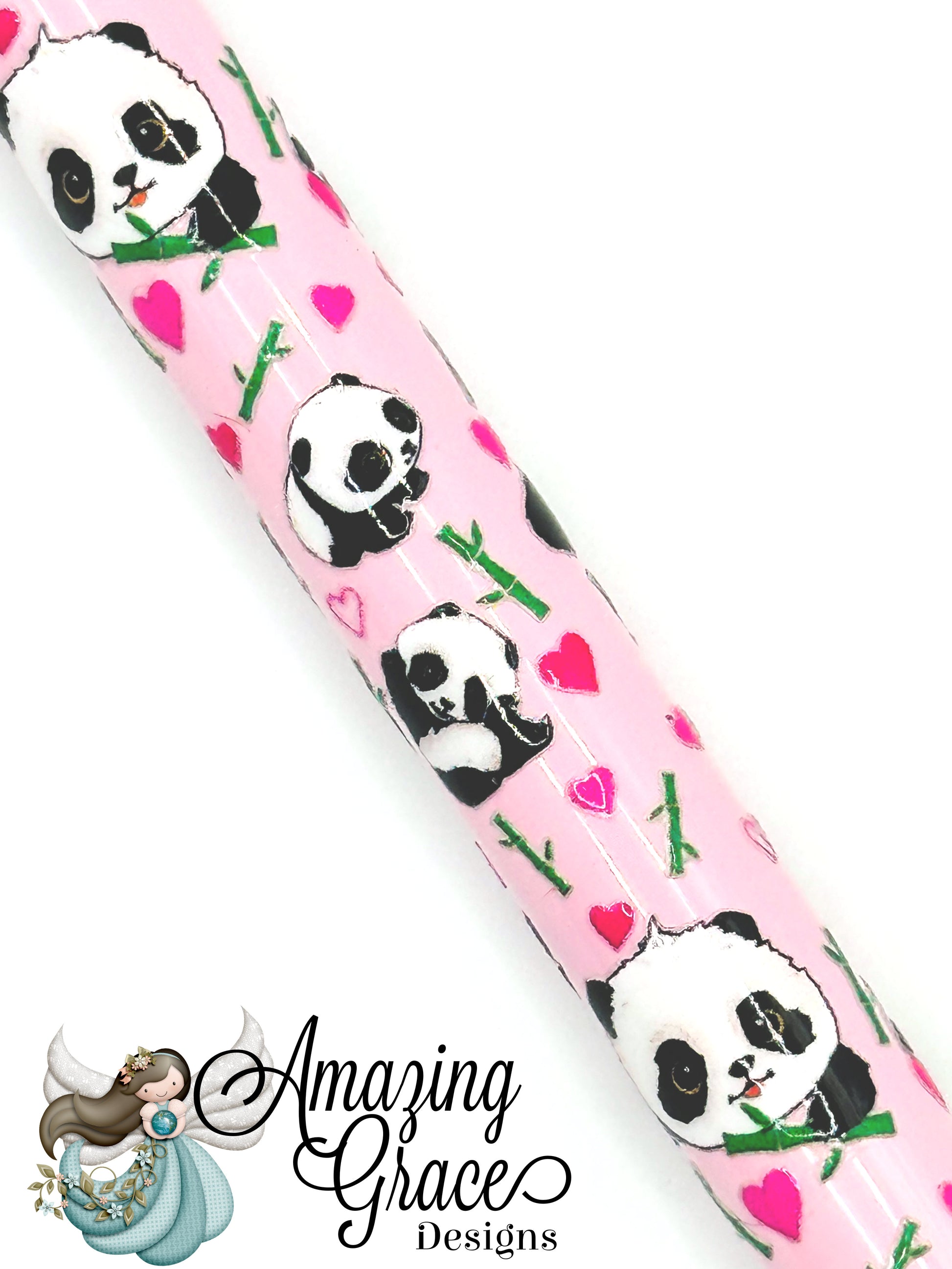 This adorable pen is perfect for any panda lover or animal enthusiast. This high-quality ballpoint pen is decorated with a durable UVDTF wrap featuring a soft pink background. The design is covered in a charming pattern of pandas, green bamboo stalks, and sweet pink hearts. Finished with sleek silver-toned accents, this pen writes with smooth black ink and is a stylish and functional accessory for school, work, or journaling.