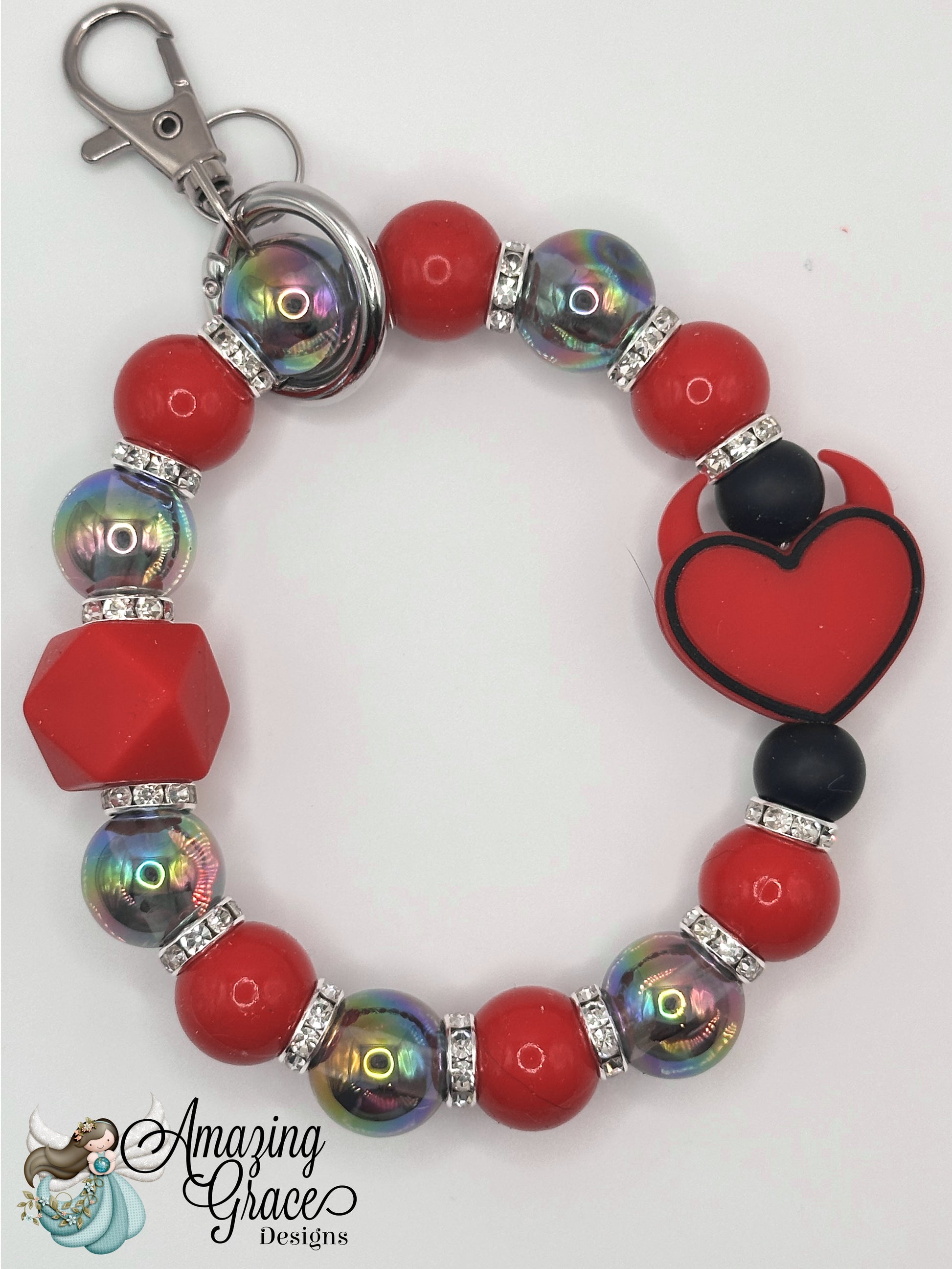Unleash your playful side with this fiery 3-piece set! It includes a sparkling black glitter pen, a coordinating keychain wristlet, and a fun tumbler charm, all featuring vibrant red and iridescent beads, accented with an adorable "devil heart" charm. Perfect for adding a bold and unique touch to your daily accessories.