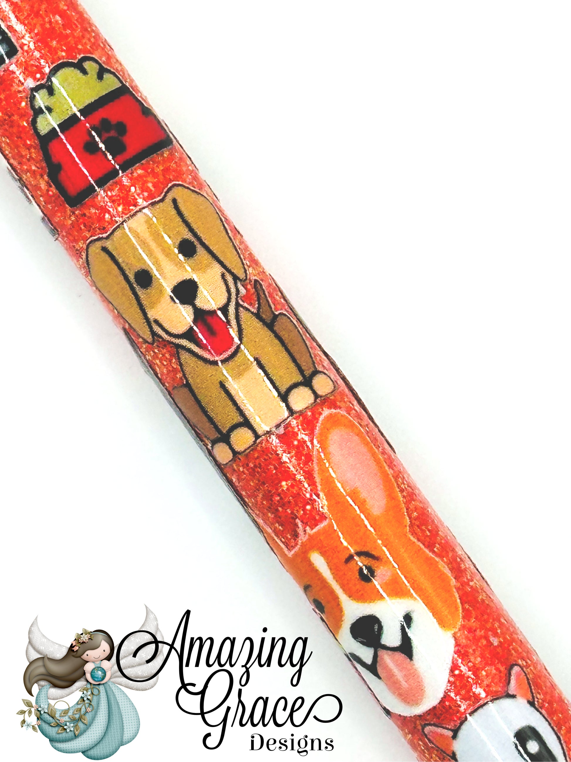 Show your love for your furry friends with this adorable and sparkly pen. This high-quality ballpoint pen is decorated with a durable UVDTF wrap featuring a glittery orange background. The wrap is covered in a fun pattern of different dog breeds and playful pet-themed icons. Finished with sleek silver-toned accents, this pen writes with smooth black ink and is a stylish and functional accessory for any dog owner or pet professional.