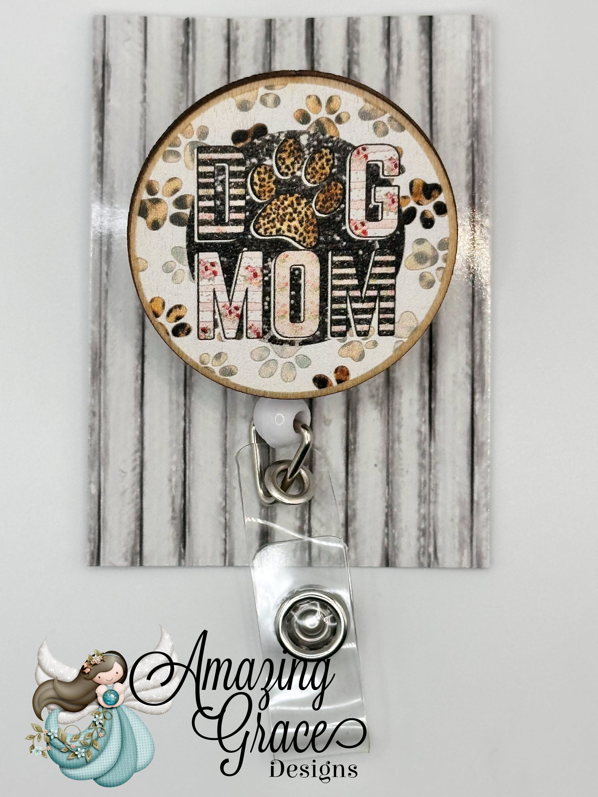 "DOG MOM" Wooden Disc Retractable Badge Reel - Paw Print & Leopard Print Design