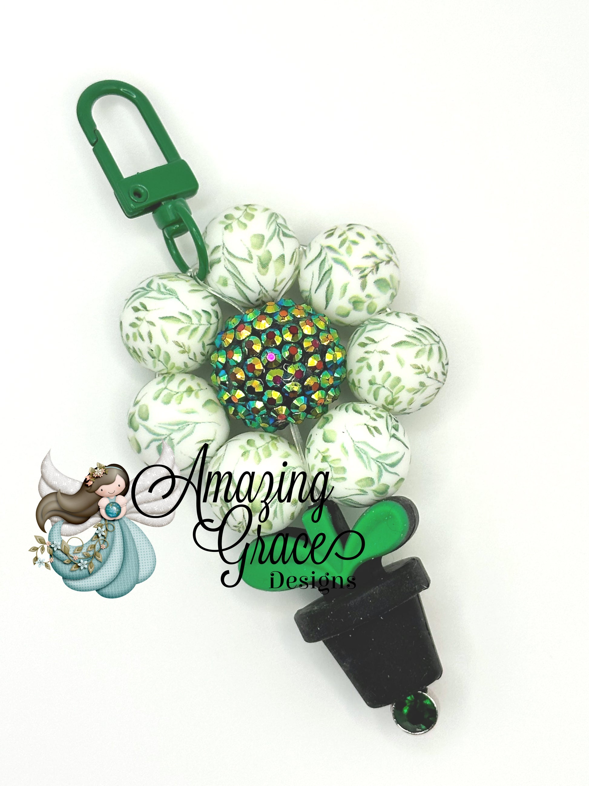 Bring a touch of nature's beauty and sparkle to your everyday essentials! This unique beaded charm features white beads with delicate green leaf patterns, a dazzling multi-color iridescent rhinestone bead, and a chic black flowerpot with a coordinating green gemstone dangle.