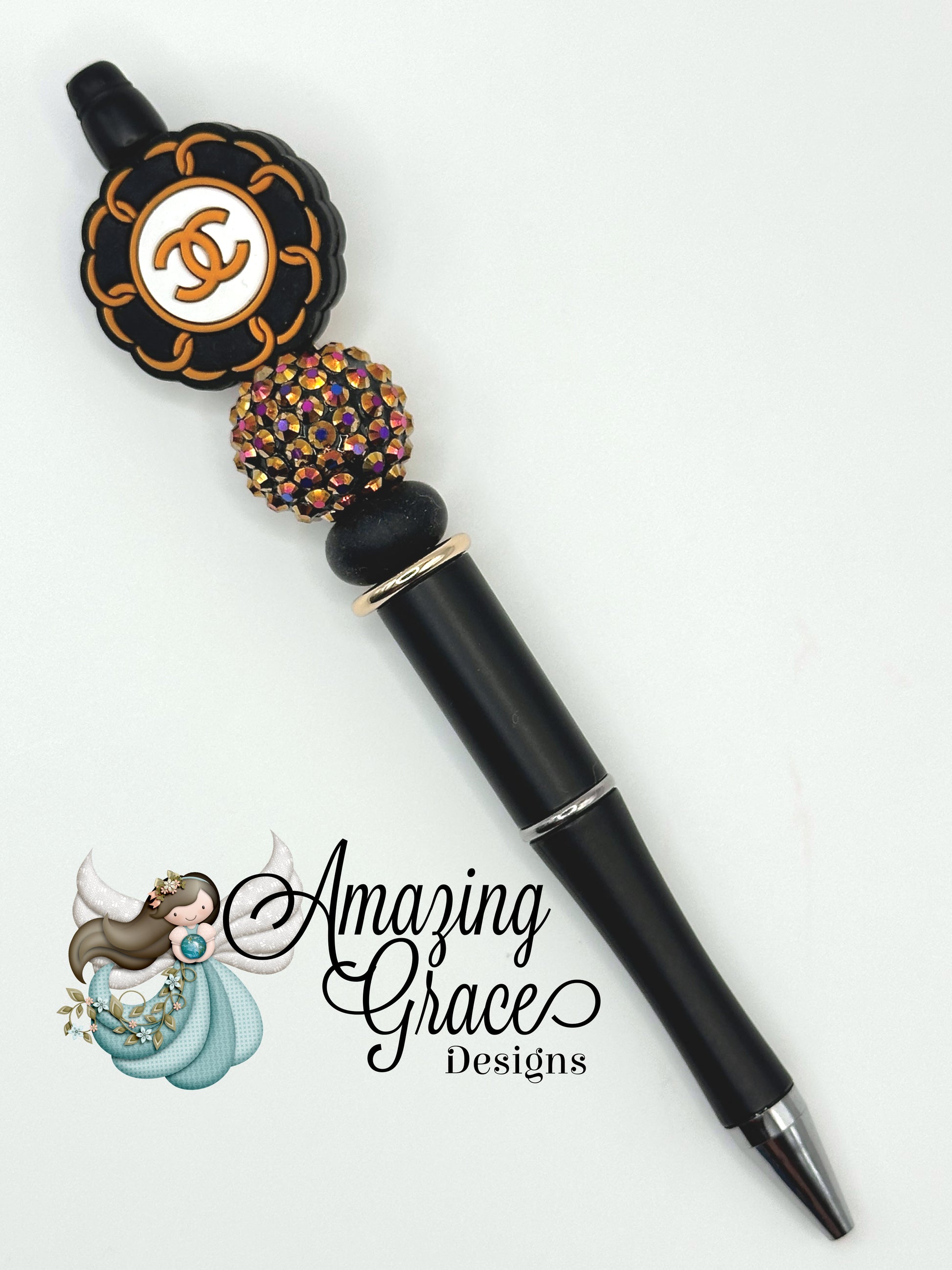 Elevate your everyday style with this chic luxury coordinating set! Featuring an inspired black pen with glittering accents and a unique luxury-inspired emblem, paired with a matching wristlet keychain adorned with lustrous gold and sparkling beads, this duo brings a touch of refined glamour to your accessories.