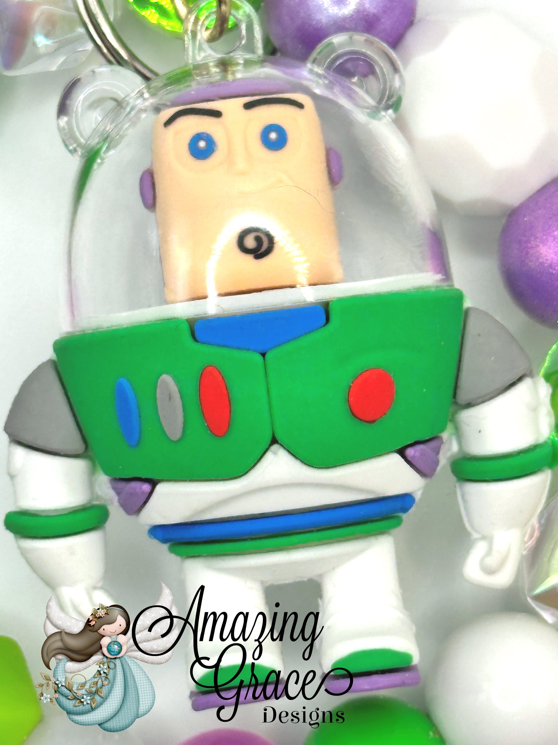 This exciting keychain bracelet features a brave space ranger character in his iconic green, white, and purple suit with a clear helmet. It's adorned with a stellar array of beads including bright greens, purples, and white, along with iridescent and faceted accents, making it a fantastic accessory or gift for adventurers of all ages.