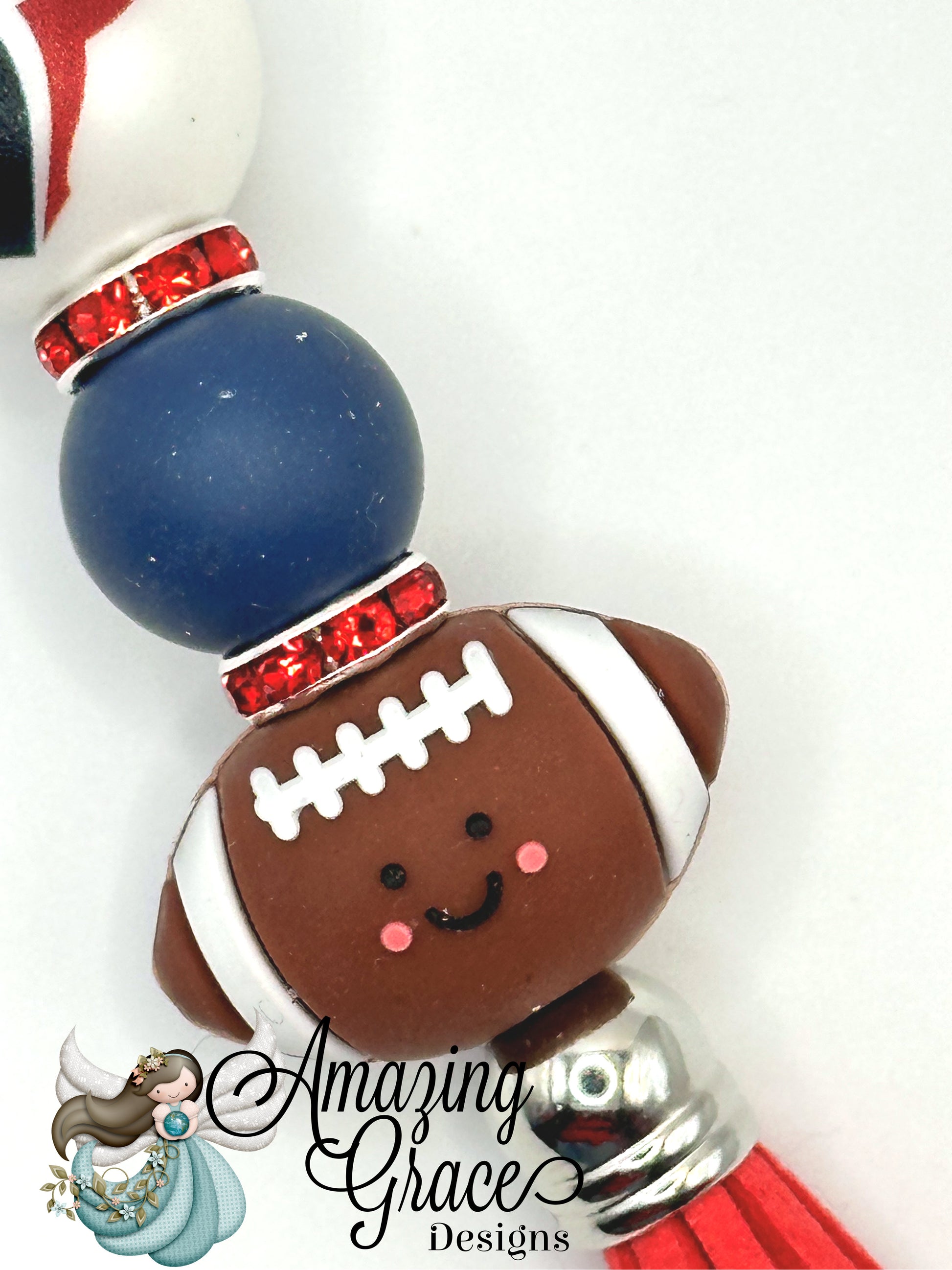 Show your passion for the game with this vibrant charm, featuring bold red, white, and blue beads accented with sparkling spacers and a playful football design. Complete with a matching tassel and sturdy clasp, it's perfect for accessorizing bags, keys, or lanyards, adding a touch of spirited style to your everyday essentials.