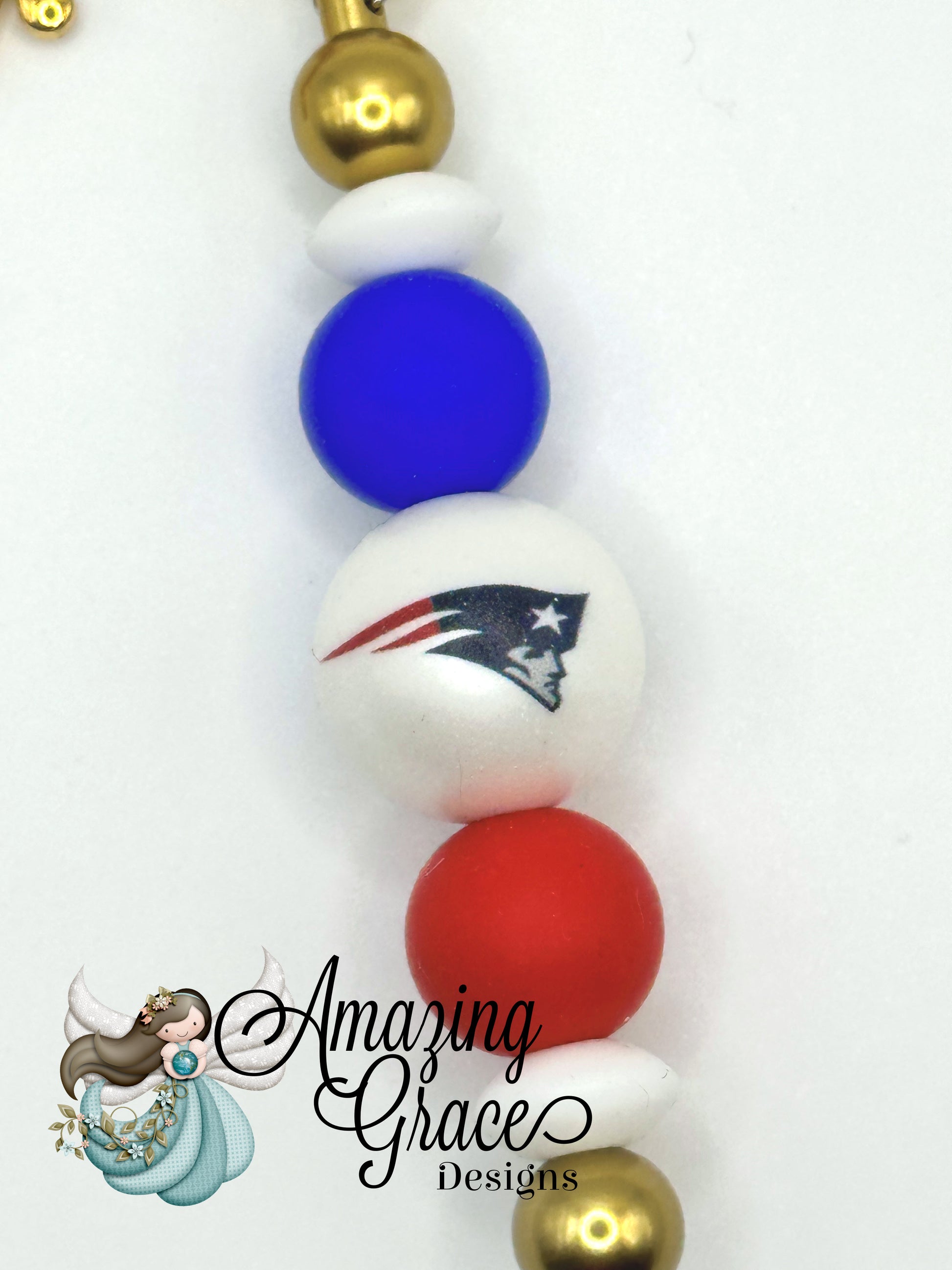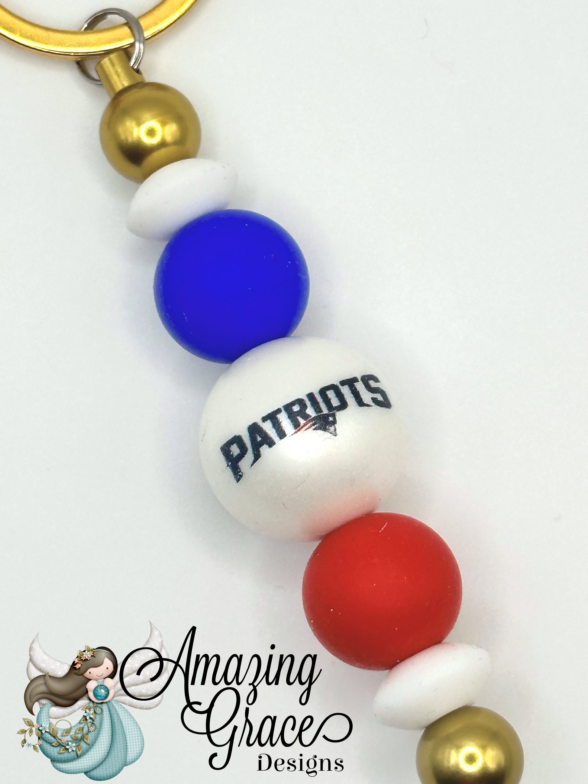 Show your pride with this striking keyring featuring a central white bead adorned with the team name and a patriotic emblem. It's accented with vibrant matte red and royal blue beads, as well as smaller white and metallic gold beads, all secured on a polished gold-toned keyring with a lobster clasp. This is the perfect accessory for any dedicated supporter.