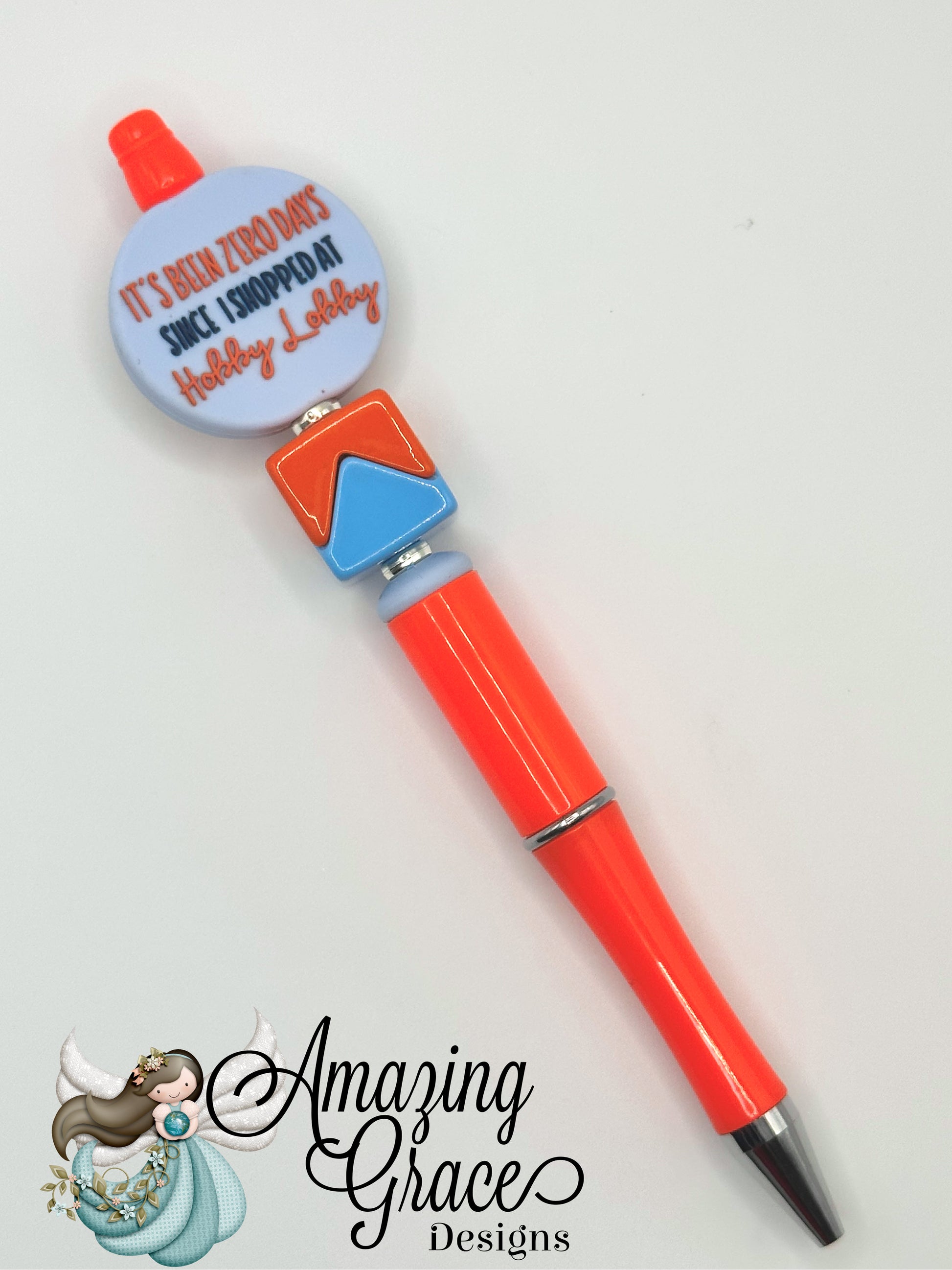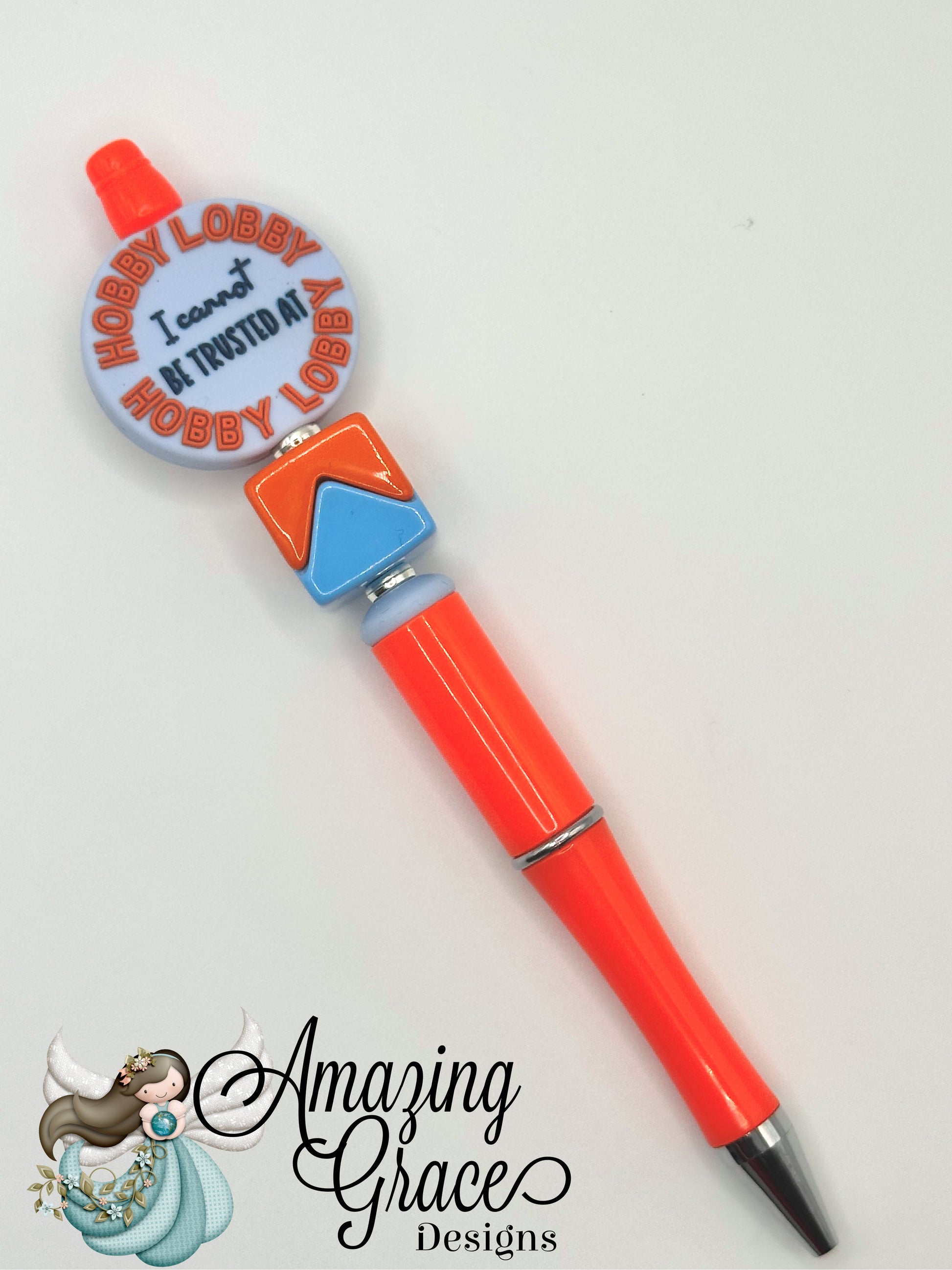 A humorous and relatable pen for any crafter or decorator. This bright orange beaded pen features a "I cannot be trusted at Hobby Lobby" silicone focal and blue and orange beads. The perfect gift for your crafting friend or a fun accessory for your desk.