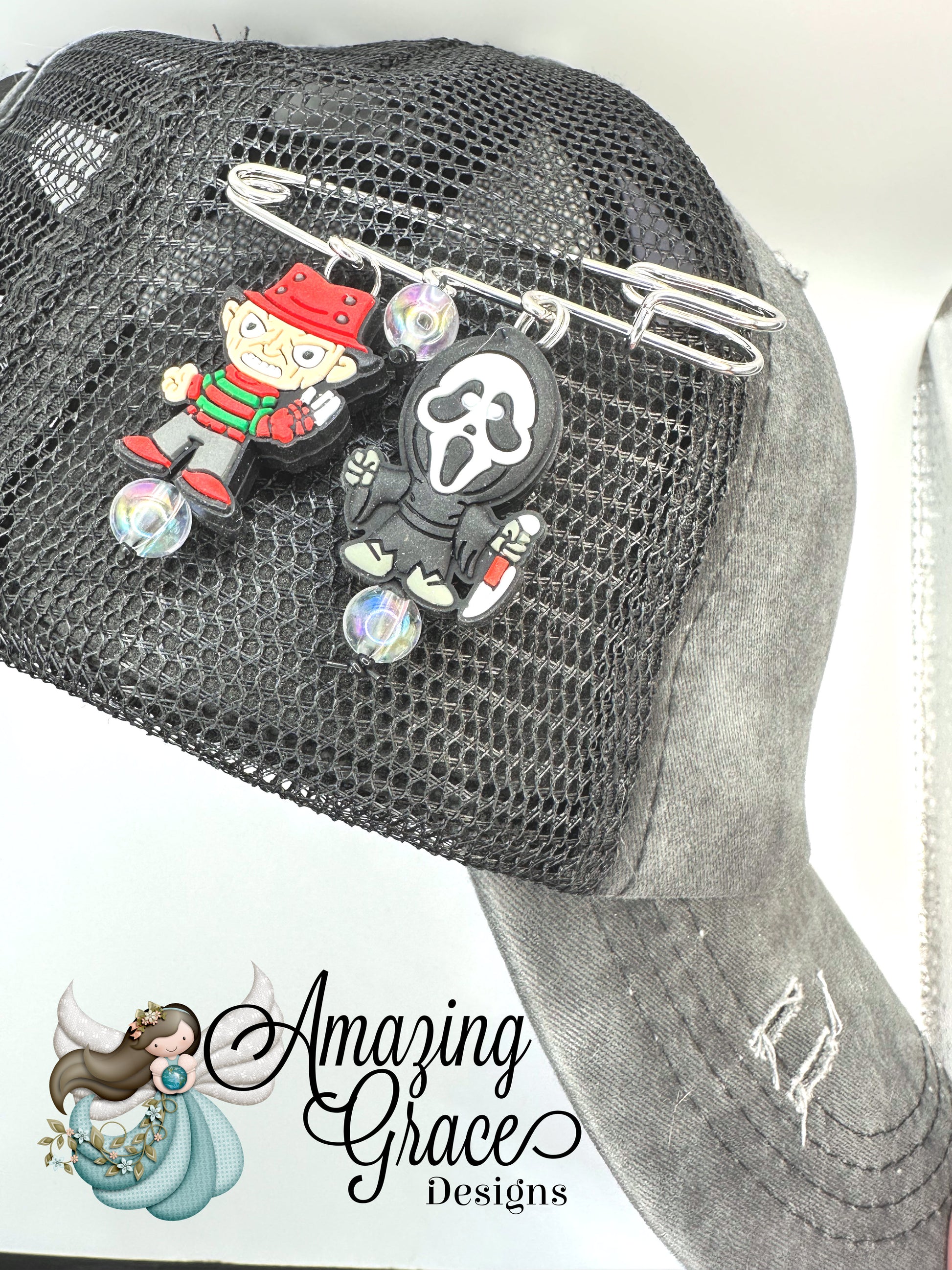 Showcase your love for classic thrillers with this striking oversized safety pin, featuring two iconic horror-inspired character charms and shimmering iridescent beads. This bold accessory is designed to add an edgy, recognizable touch to your hats, bags, jackets, or any fabric item, celebrating your favorite frights.