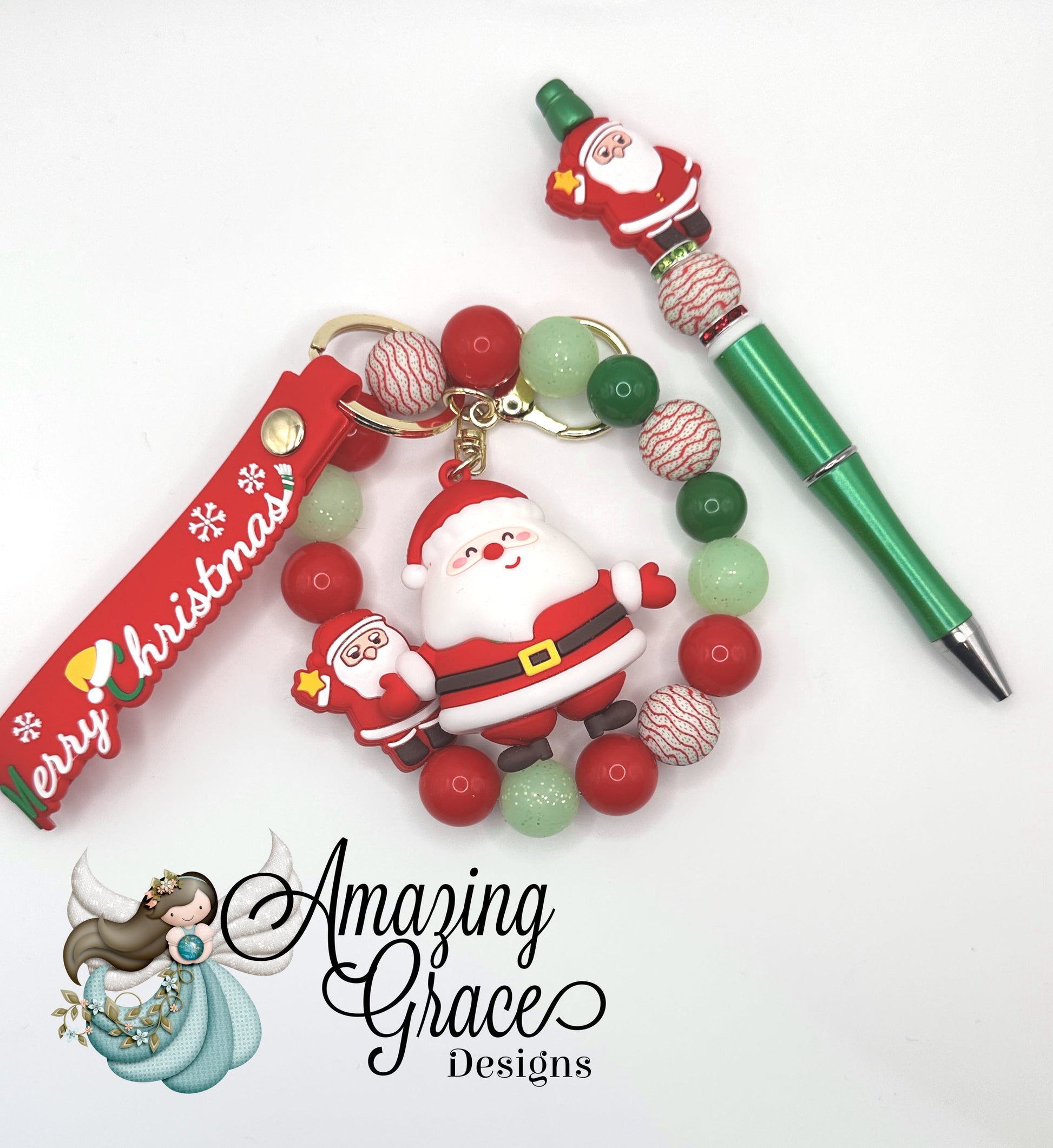 Ho-ho-holiday spirit is here! Brighten your season with this whimsical Jolly Santa pen and matching multi-charm wristlet set. Decked out in festive reds and greens, complete with adorable Santa figures and a "Merry Christmas" strap, this delightful duo makes holiday notes sparkle and keeps your keys perfectly festive and handy!
