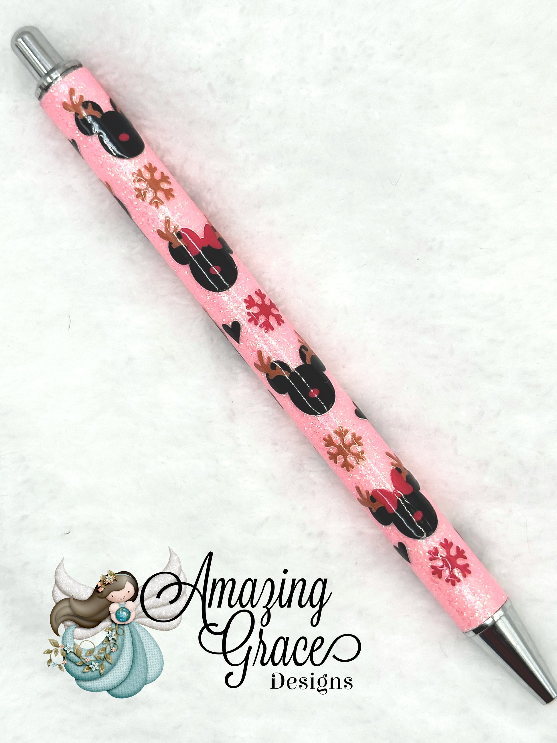 This festive pen features a cheerful pattern of a black character head with reindeer antlers and a red bow, interspersed with red snowflakes and small black hearts, all on a sparkling pink glitter background. It's a delightful accessory for holiday gifting or adding a touch of festive charm to your stationery.