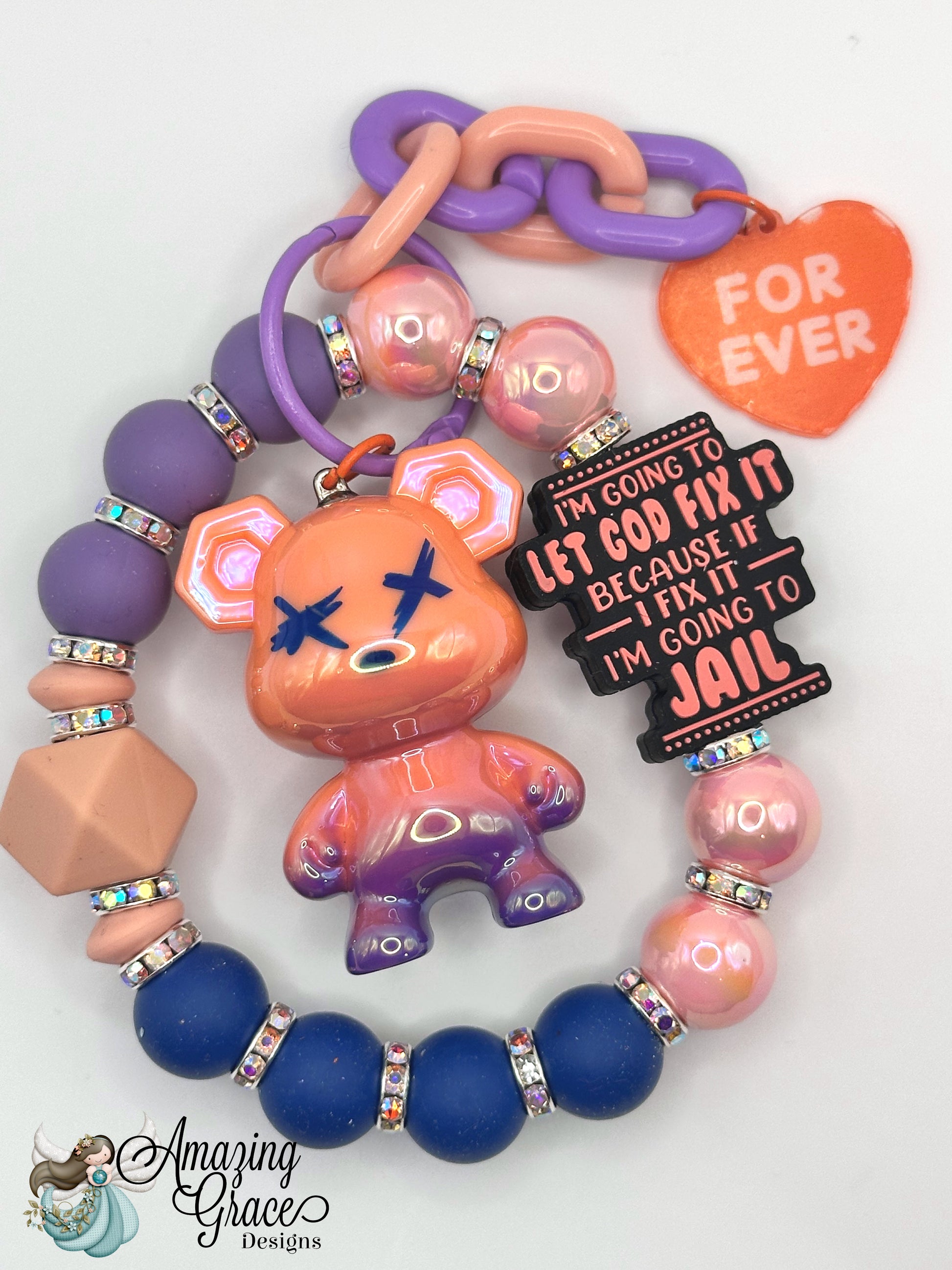 This isn't your average wristlet! It's a playful, sparkly, and utterly unique piece that's ready to add a little chaotic good to your purse, keychain or wrist. Featuring a delightfully mischievous bear charm and a sassy quote that perfectly captures life's more... challenging moments. Each chunky bead is a pop of color and glimmer, making this wristlet a true conversation starter. It's the perfect accessory for anyone who knows that sometimes, you just have to let God handle it.