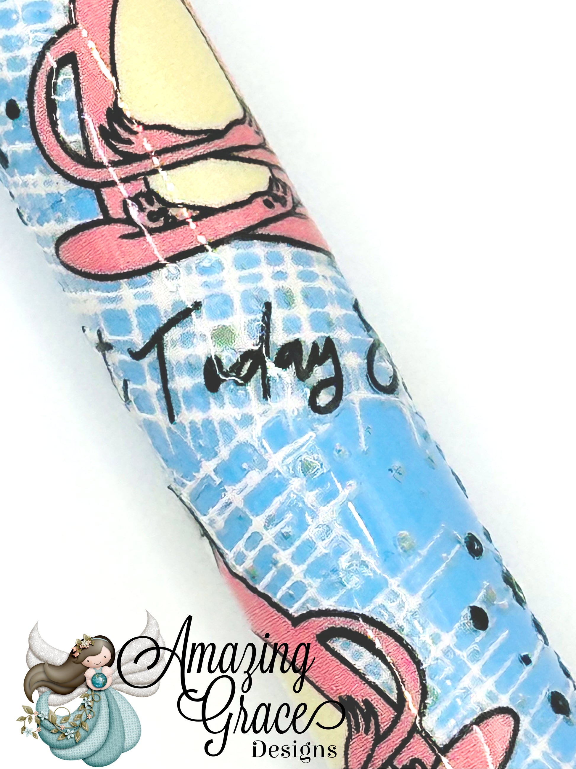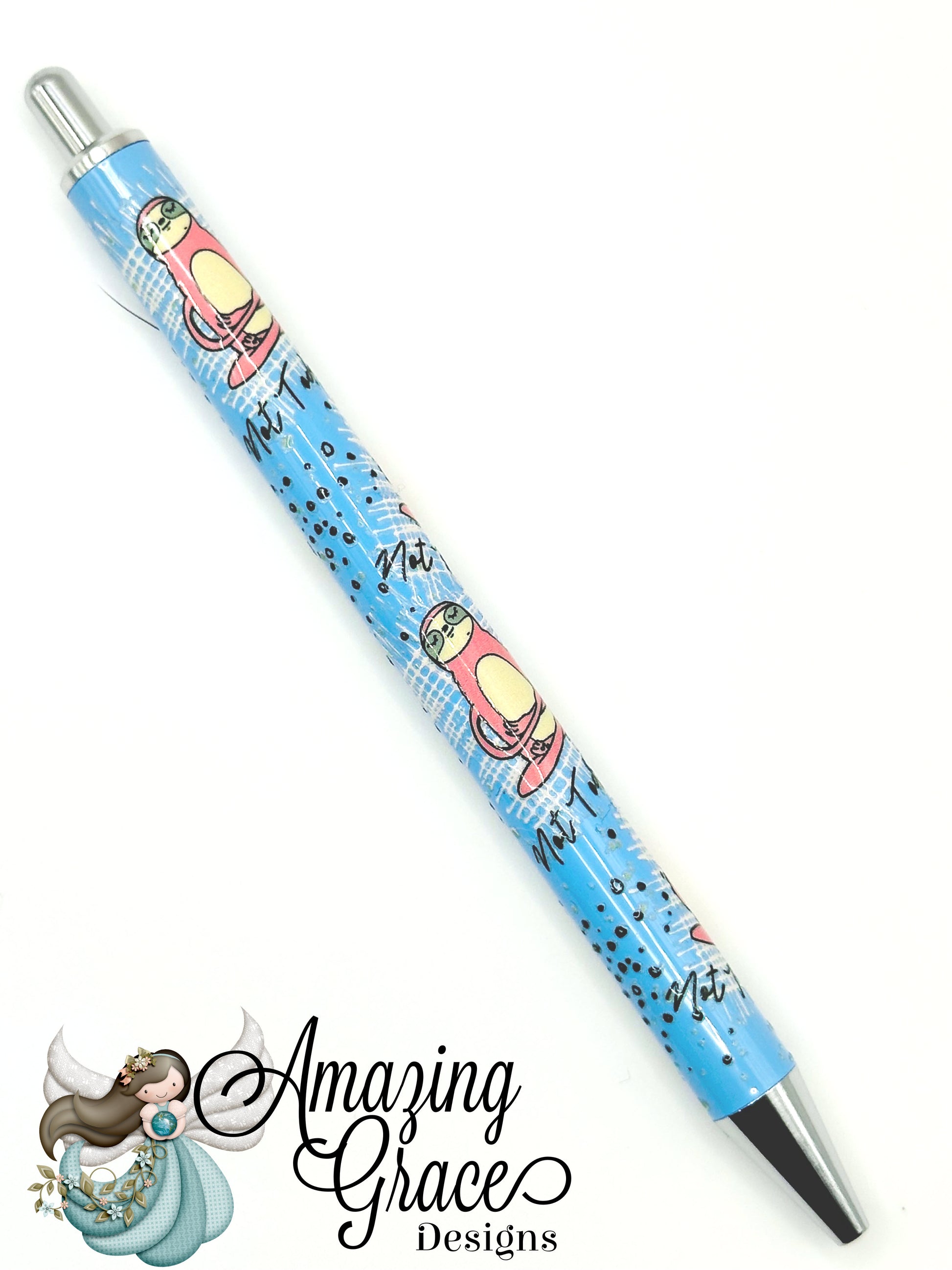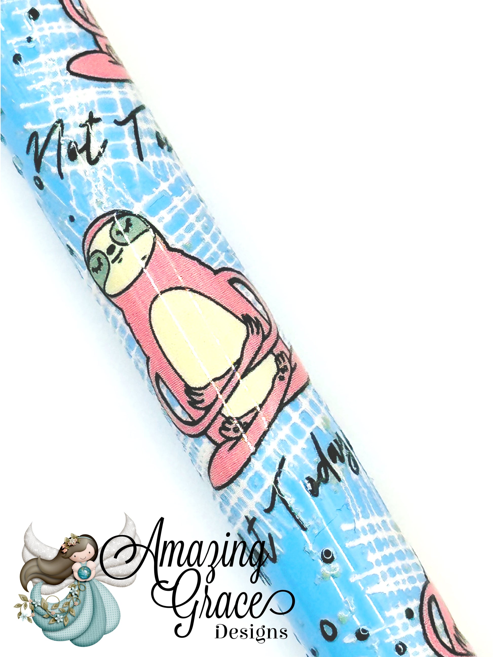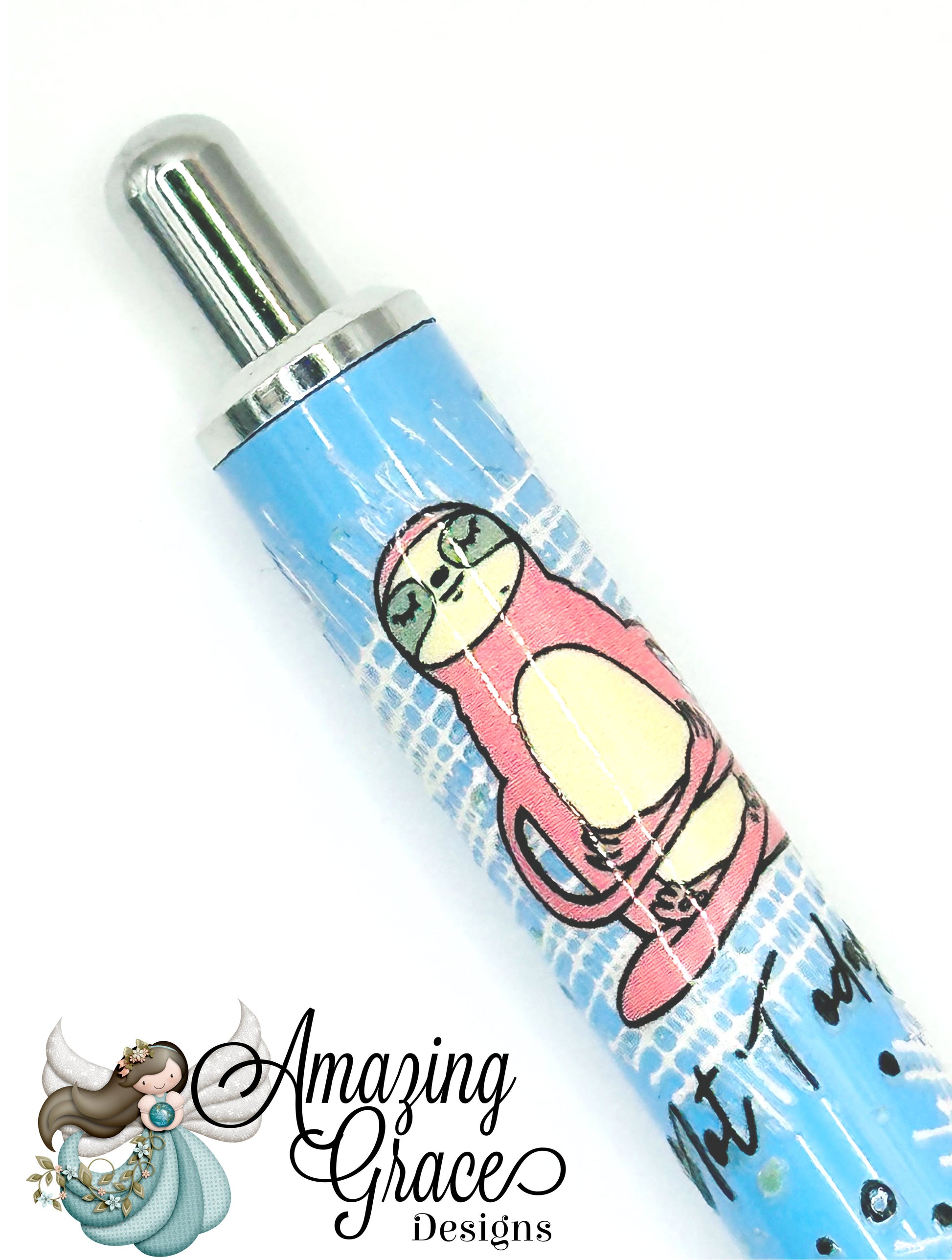 Start your day with a laugh and a dose of determination with this humorous pen. This high-quality ballpoint pen is decorated with a durable UVDTF wrap on a light blue background. The design features a repeating pattern of calm sloths in a yoga pose alongside the bold and witty phrase, "Not Today Satan." Finished with sleek silver-toned accents, this pen writes with smooth black ink and is a fun and functional accessory for work, school, or just for jotting down notes.