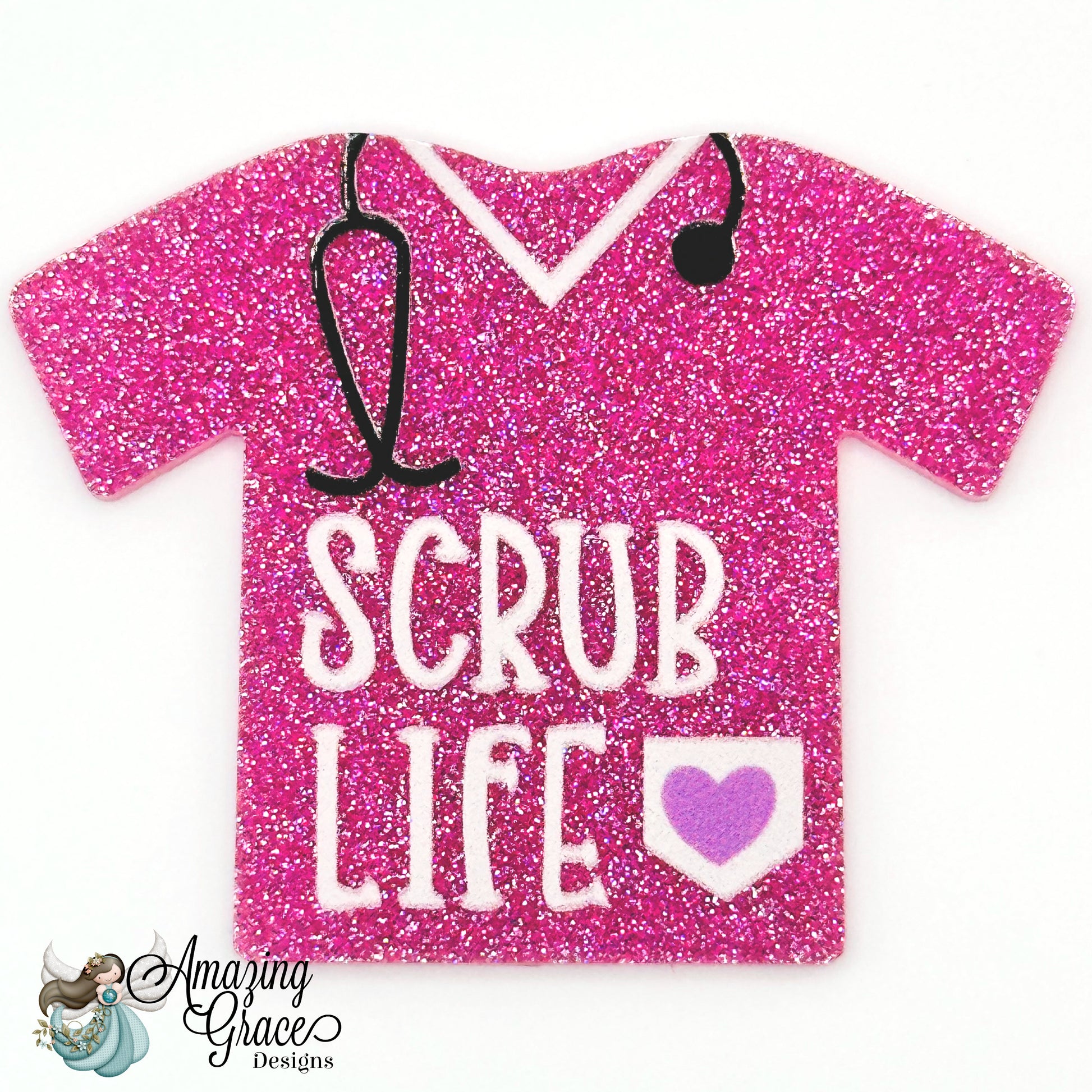 Embrace your calling with this sparkling "Pink Scrub Life" Badge Topper! This vibrant pink glitter scrub top features a stethoscope and "SCRUB LIFE" text with a heart detail. It's a durable acrylic charm that easily attaches to your ID with Velcro. Perfect for nurses and healthcare professionals! (Badge reel not included.)