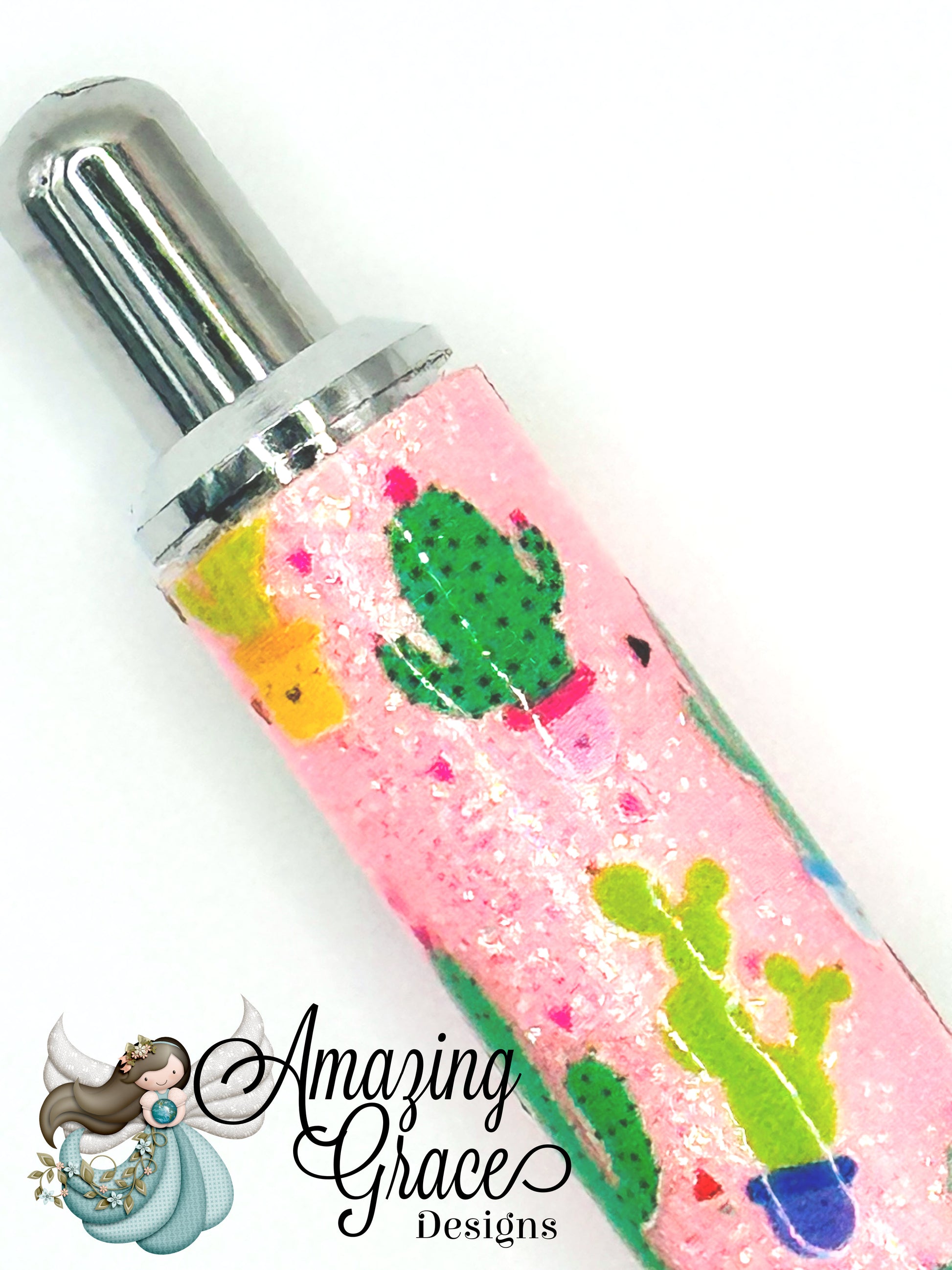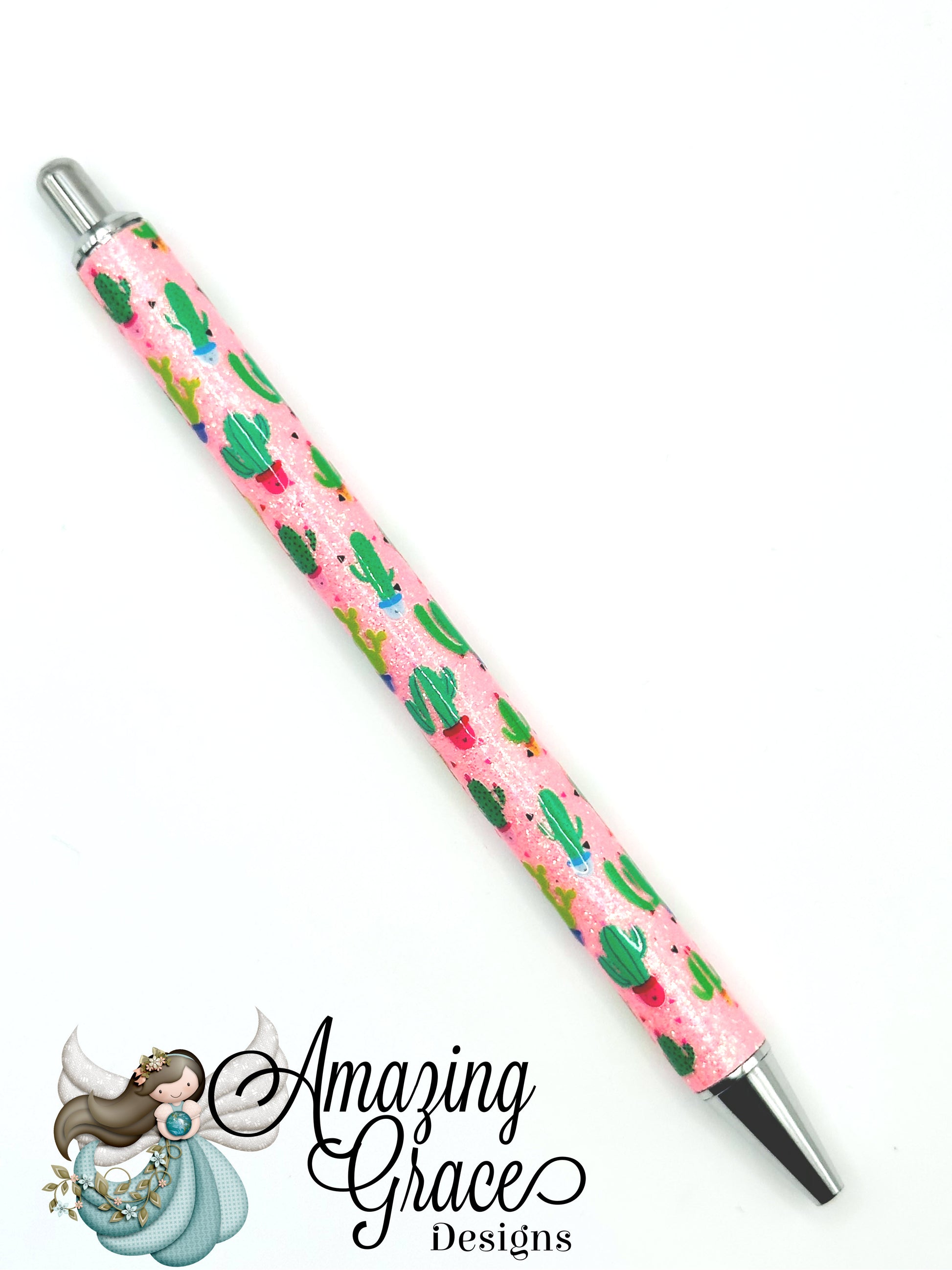 Bring a little bit of the desert indoors with this adorable and sparkly cactus pen. This high-quality ballpoint pen is decorated with a durable UVDTF wrap featuring a fun pattern of various potted cacti and succulents. The design is set against a sparkly pink glitter background and finished with sleek silver-toned accents. It writes with smooth black ink and makes a perfect gift for plant lovers, gardeners, or anyone who appreciates a touch of unique style.