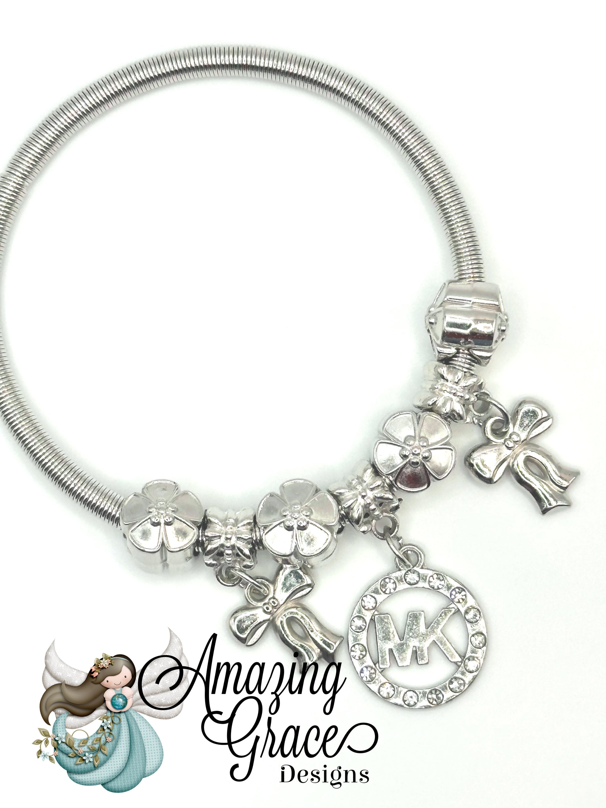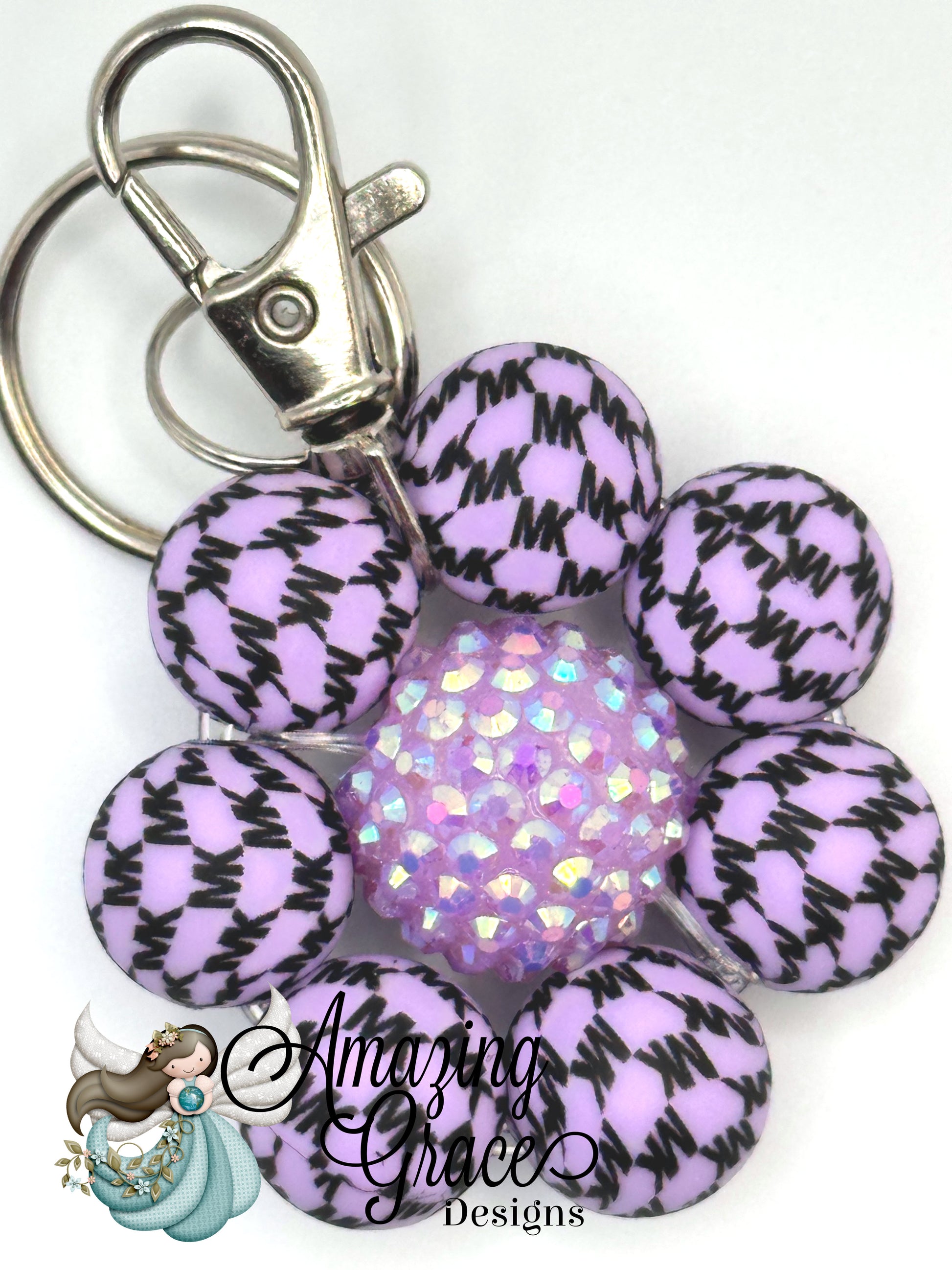 Elevate your everyday style with this delightful accessory set. The flexible silver-tone bracelet features a charming assortment of flower and bow accents, alongside a round charm adorned with a distinctive interlocking letter pattern. Complementing the bracelet is a vibrant flower-shaped keychain, showcasing purple petals with a similar elegant pattern and a dazzling, sparkling center. Both pieces add a touch of coordinated charm to your personal items or attire.