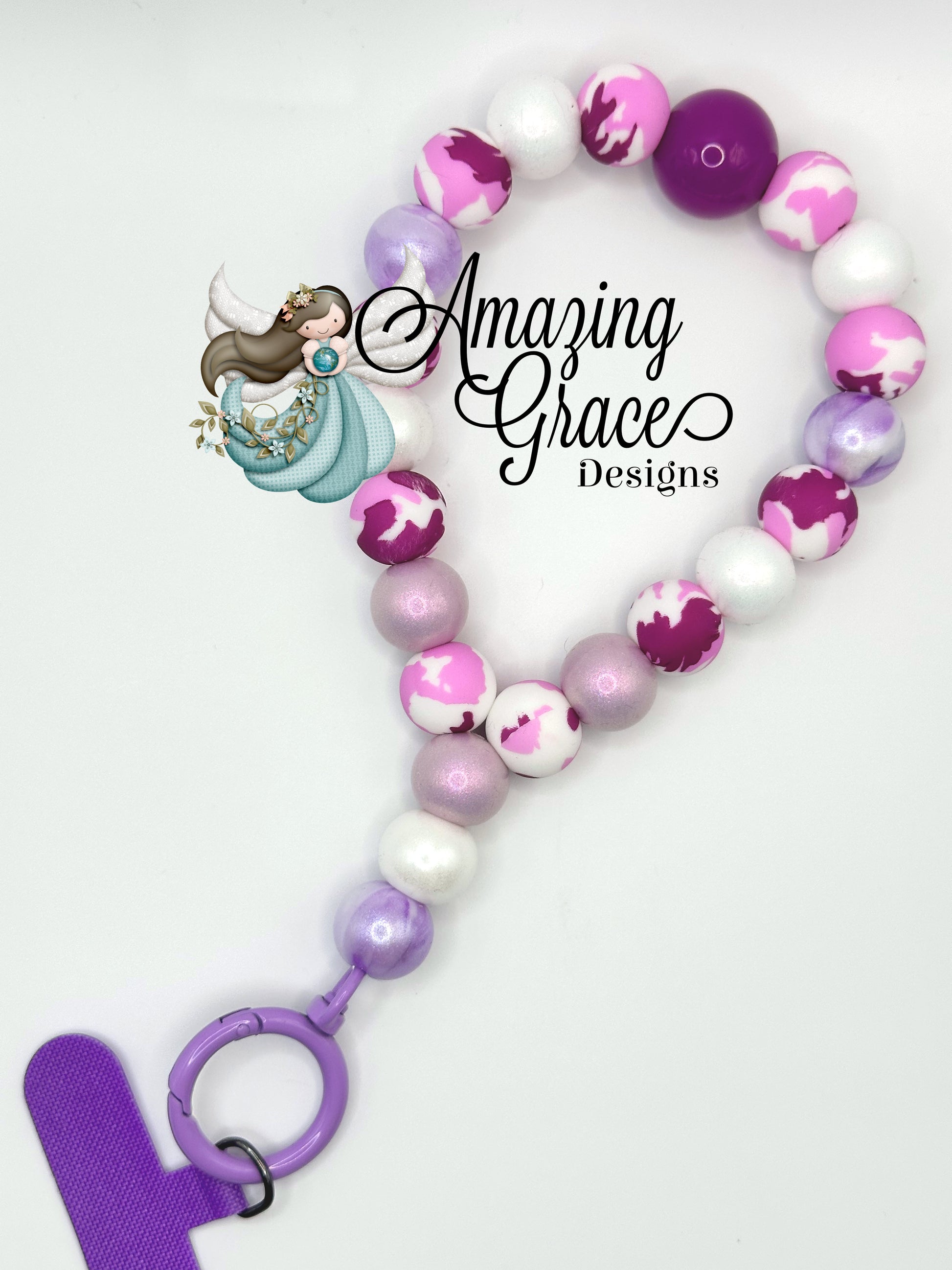 Add a touch of edgy style to your everyday essentials with this unique silicone wristlet! Featuring beads with a cool camouflage pattern in shades of purple, pink, and white, this wristlet is both stylish and practical. It's designed to keep your phone, keys, and other small items securely on your wrist while you're on the go. Please note: Cellphone case is NOT included.