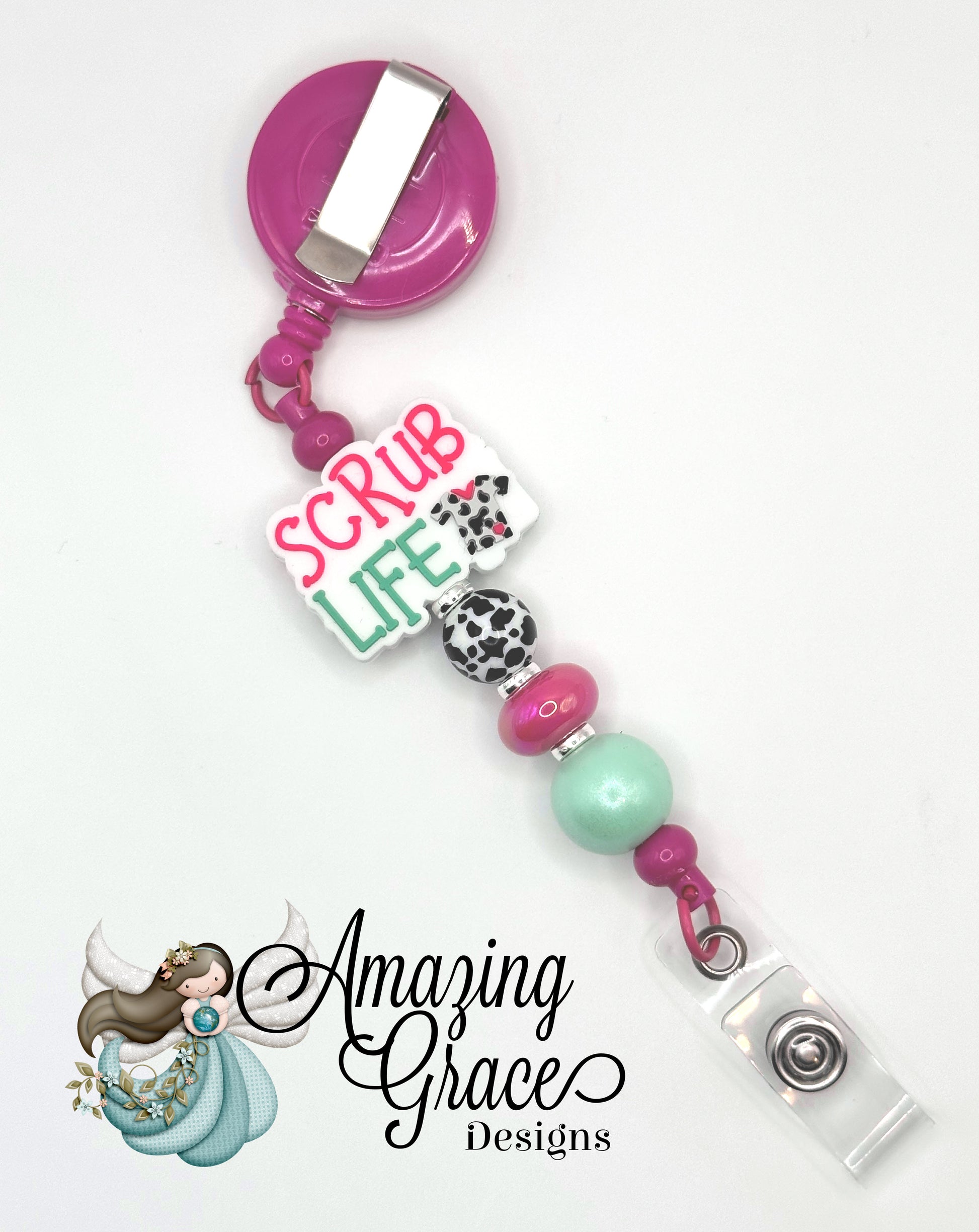Show off your dedication to the "SCRUB LIFE" with this vibrant pink and mint retractable badge reel! Featuring a playful charm and coordinated beads (including a fun black and white patterned bead), it's the perfect accessory for nurses, doctors, medical assistants, and anyone living the healthcare life. A thoughtful and practical gift to celebrate your profession!