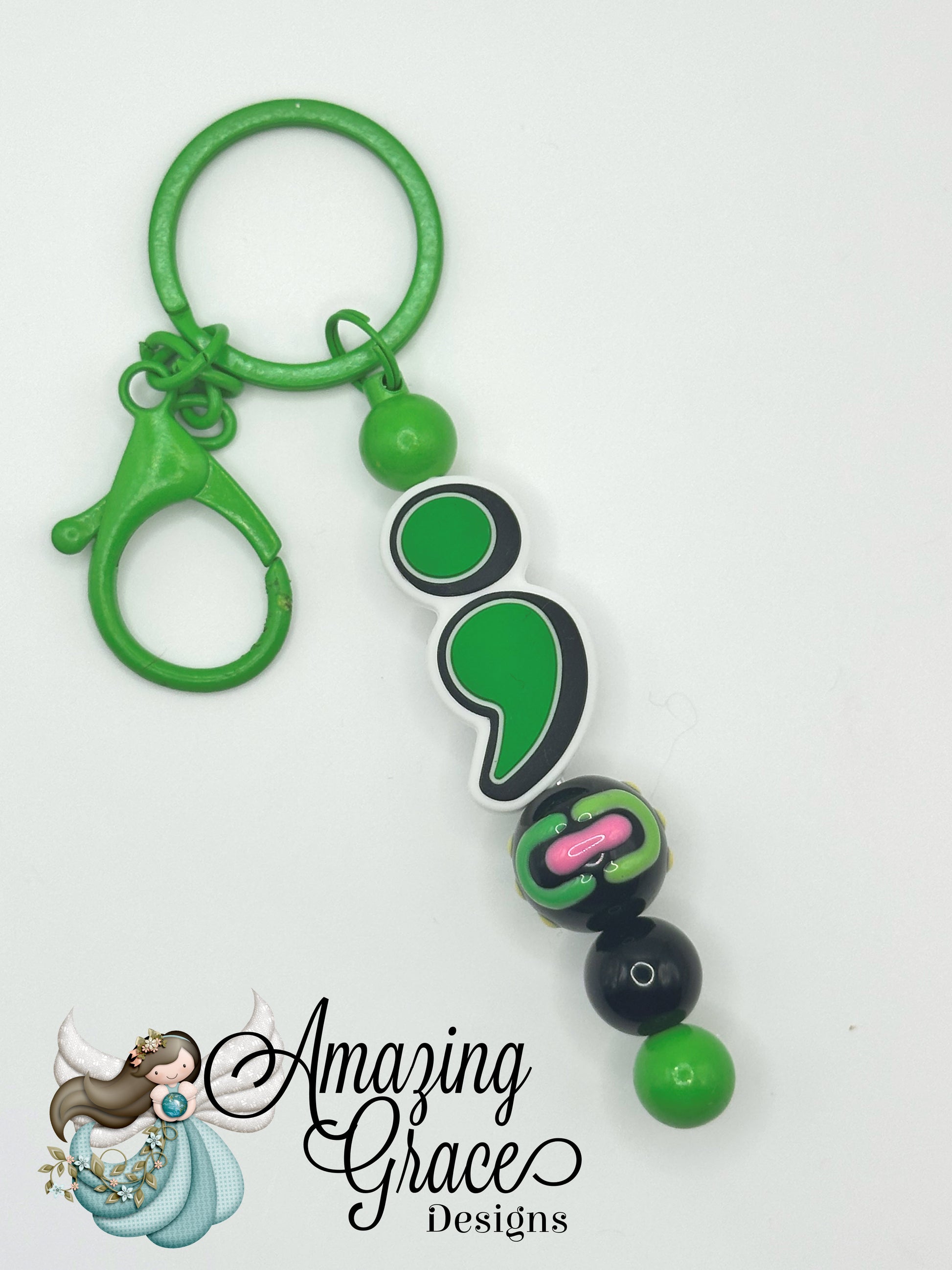 Carry a symbol of hope and solidarity with this powerful semicolon keychain. Featuring a vibrant green and black semicolon charm, representing mental health awareness and suicide prevention, this accessory is a poignant reminder that your story isn't over. A meaningful gift for personal encouragement or to show support.