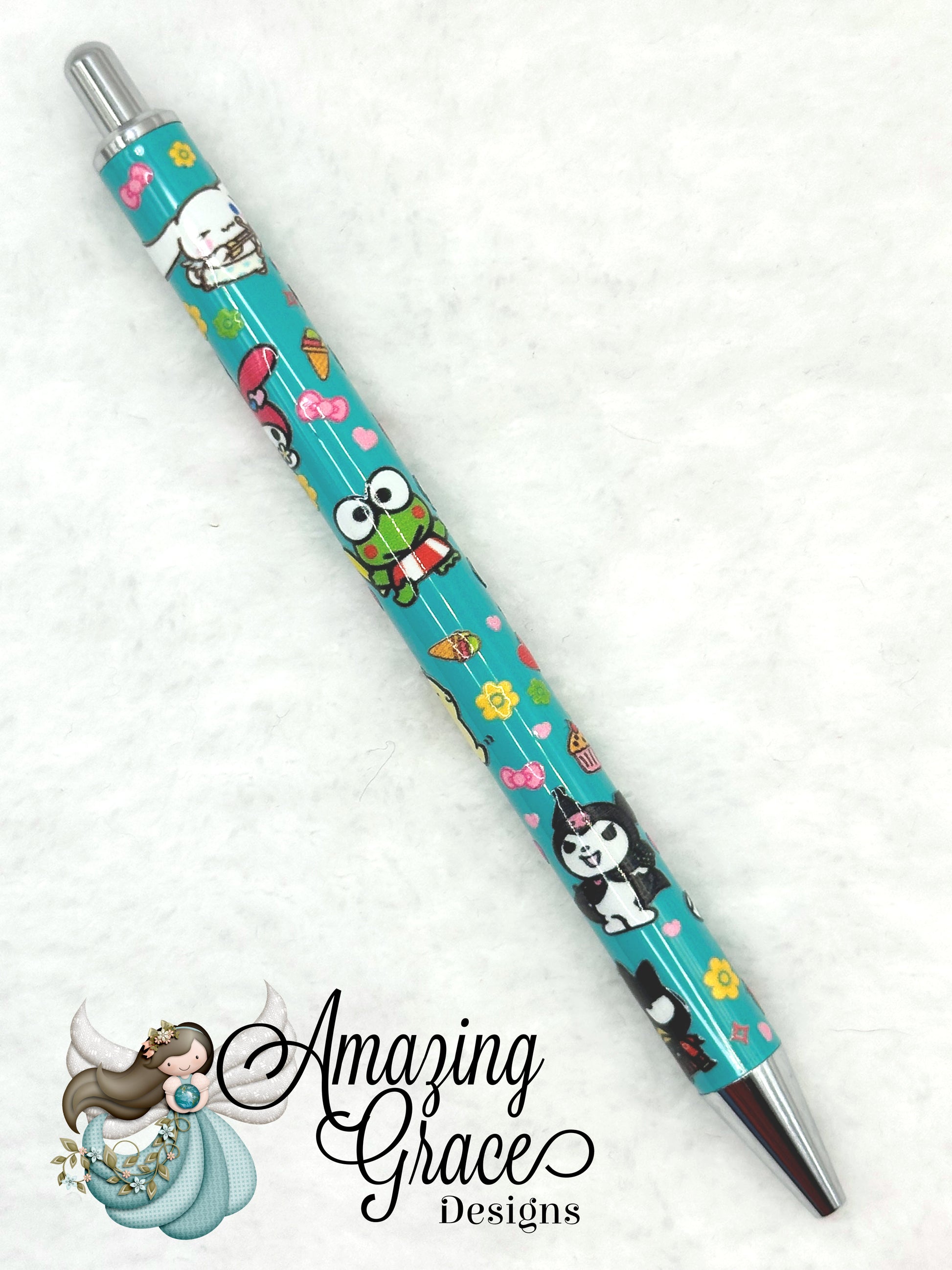 This vibrant teal pen features an assortment of playful characters, including a cheerful frog, a sweet rabbit, and other delightful figures. The design is further enhanced with scattered elements like hearts, bows, flowers, and tiny treats, making it a charming and engaging writing accessory for any fan of cute stationery.