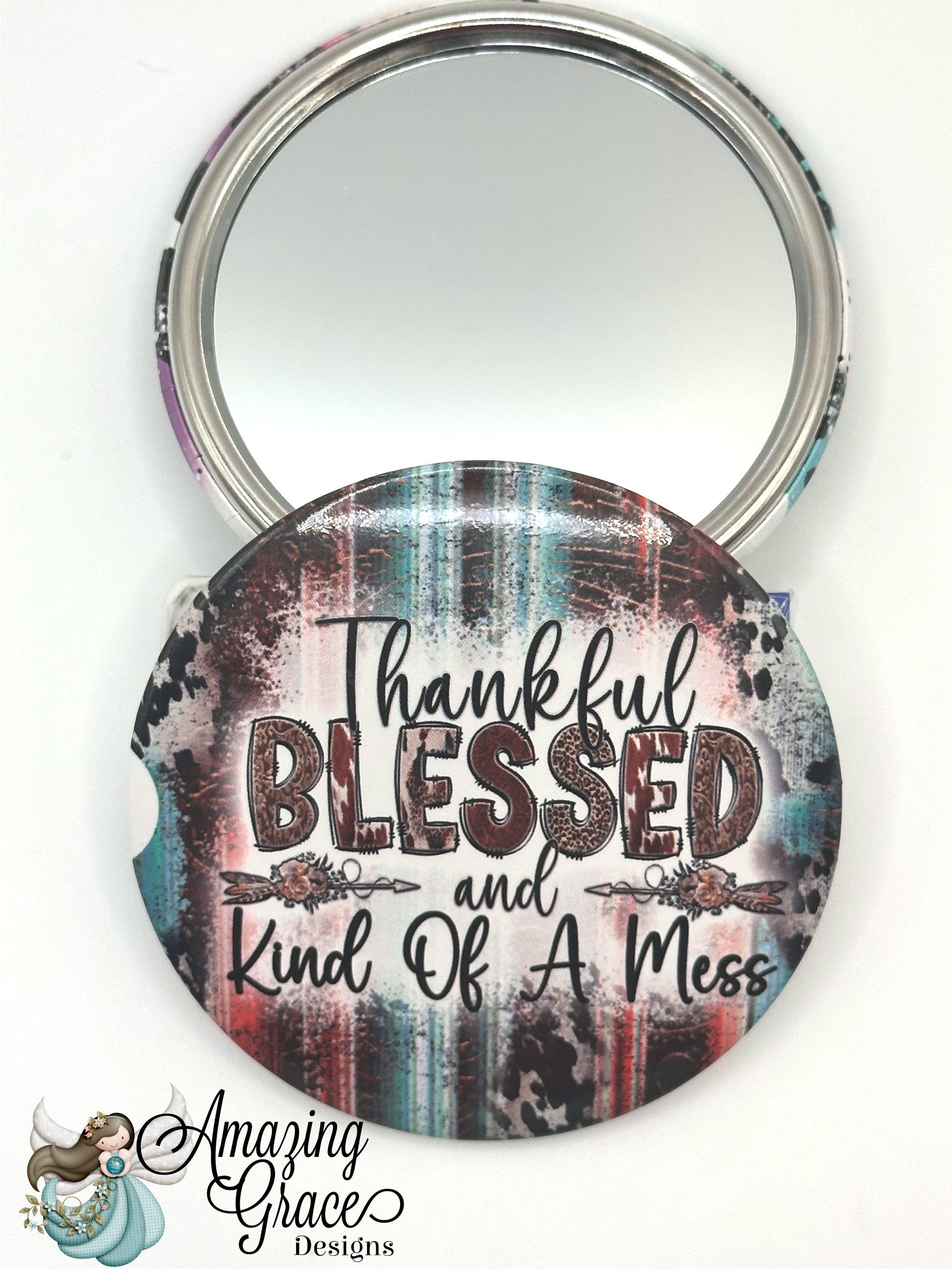Carry a dose of relatable charm with you everywhere with this "Thankful, Blessed, and Kind Of A Mess" compact mirror! This stylish accessory features a rustic plaid and distressed background, with the fun phrase highlighted in mixed fonts, including trendy leopard print on "Blessed." Perfect for quick touch-ups on the go, it's a great reminder of life's beautiful imperfections and makes a fantastic gift for friends, family, or yourself!