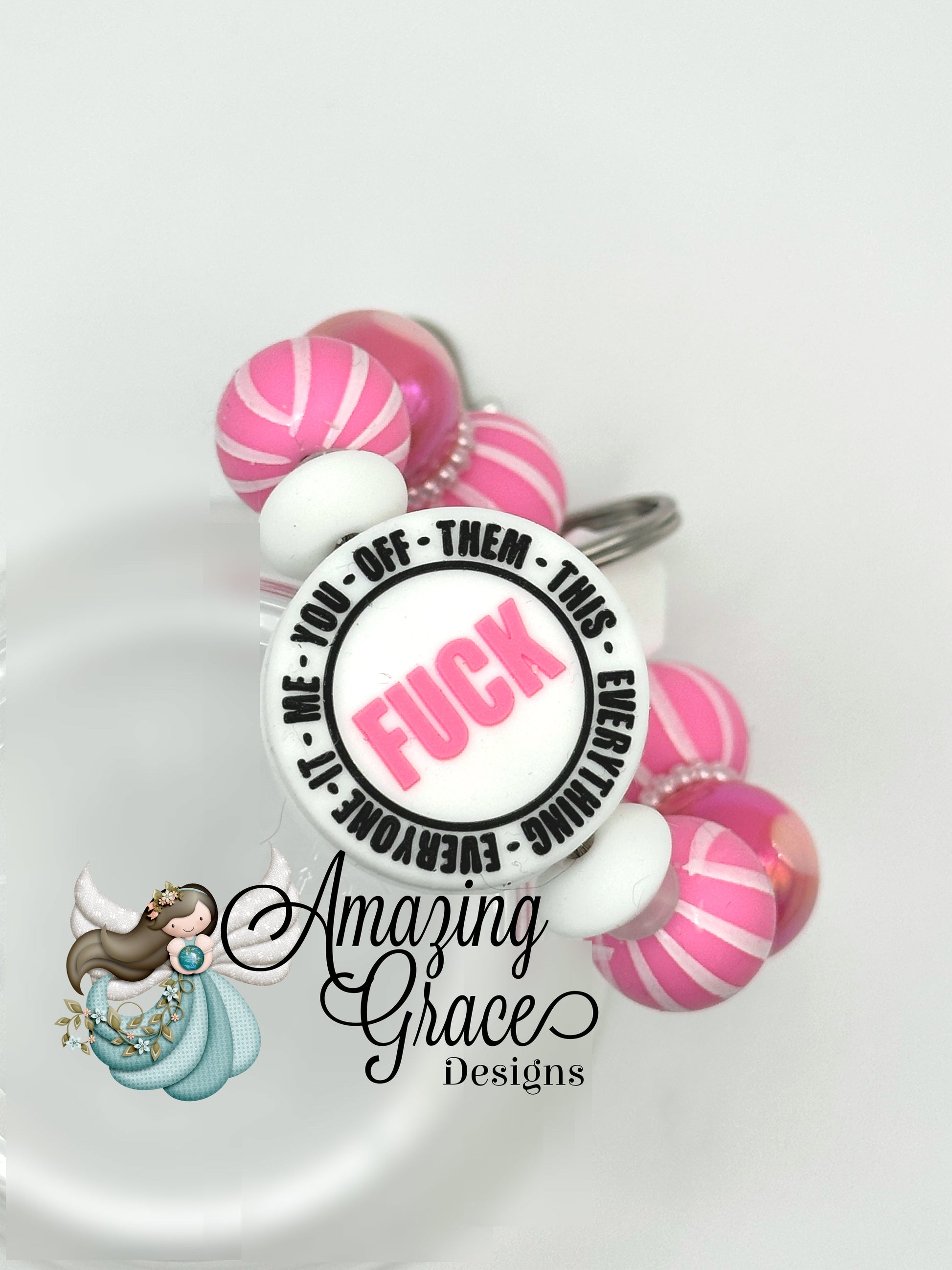 Feeling overwhelmed? Just spin the wheel! This sassy mini keychain features vibrant pink striped beads, sparkling iridescent rhinestone spacers, and a humorous "F*** It All" wheel charm with options like "You," "Them," and "Everything." Perfect for adding a dose of playful rebellion to your keys or bag.