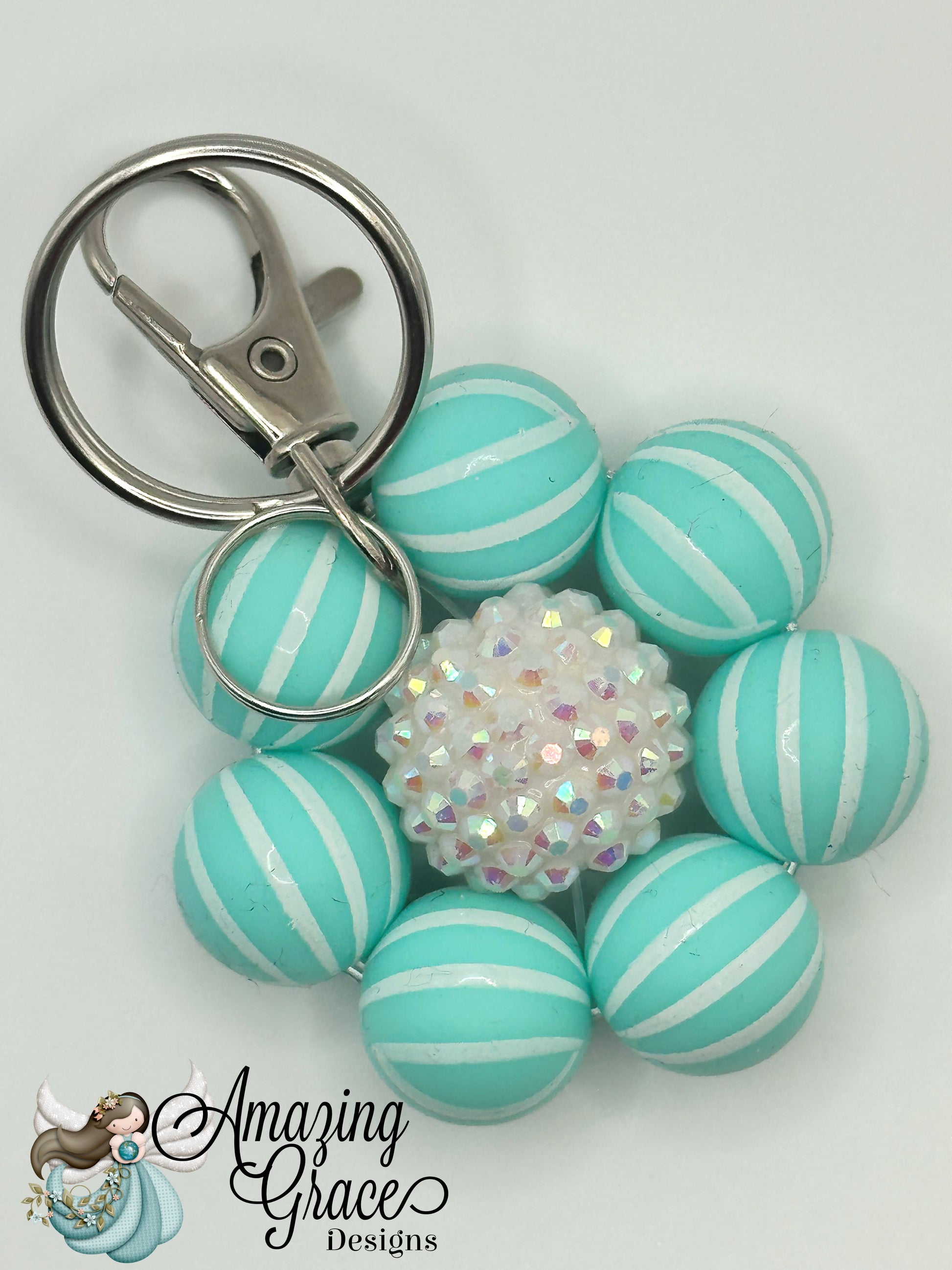 Infuse your style with effortless elegance! This stunning Tiffany Blue Stripe Beaded Charm features crisp blue and white striped beads surrounding a brilliant iridescent rhinestone core. It's the perfect accent for your keys, handbag, or backpack, adding a touch of classic charm and sophistication to any item.
