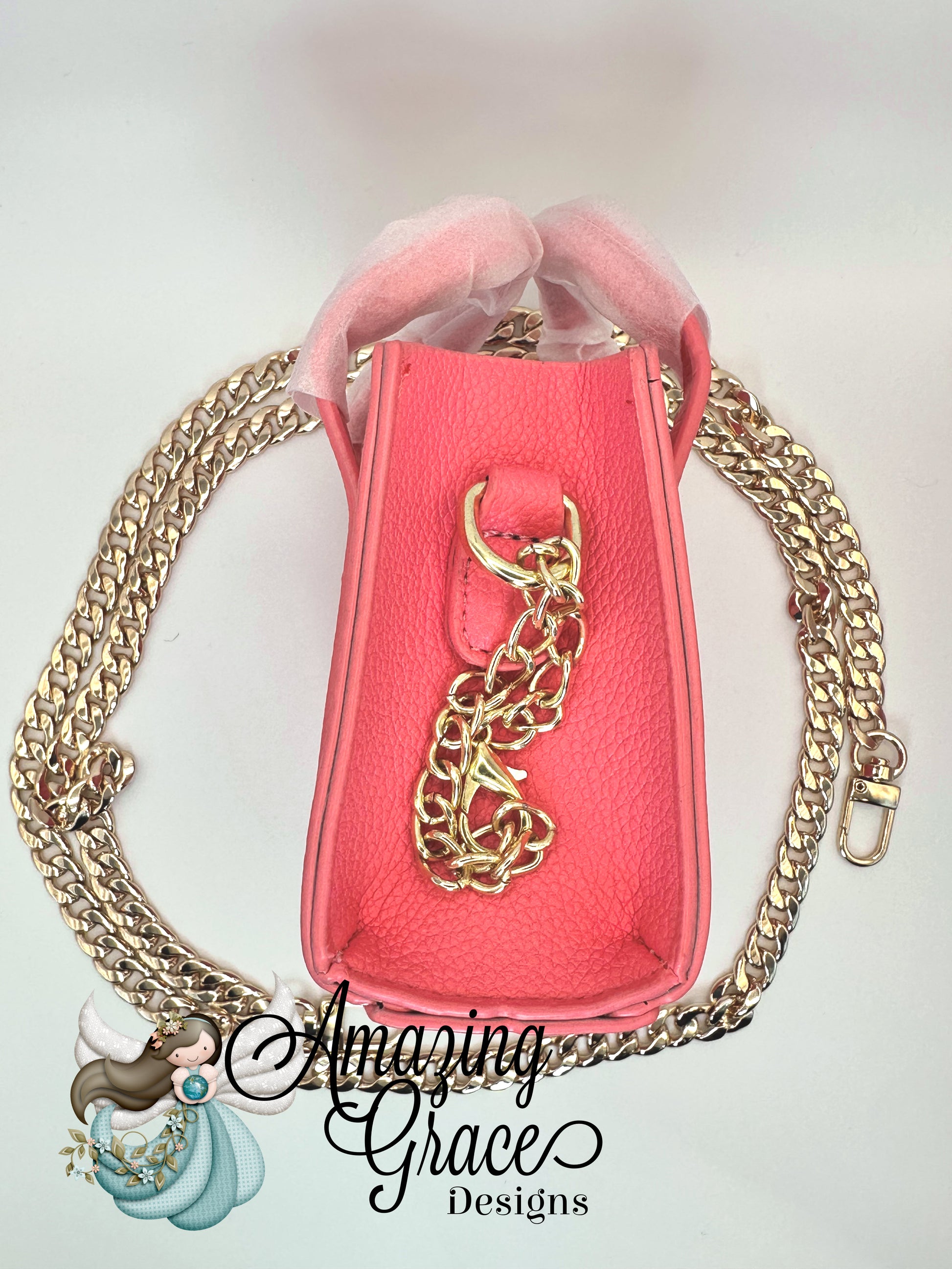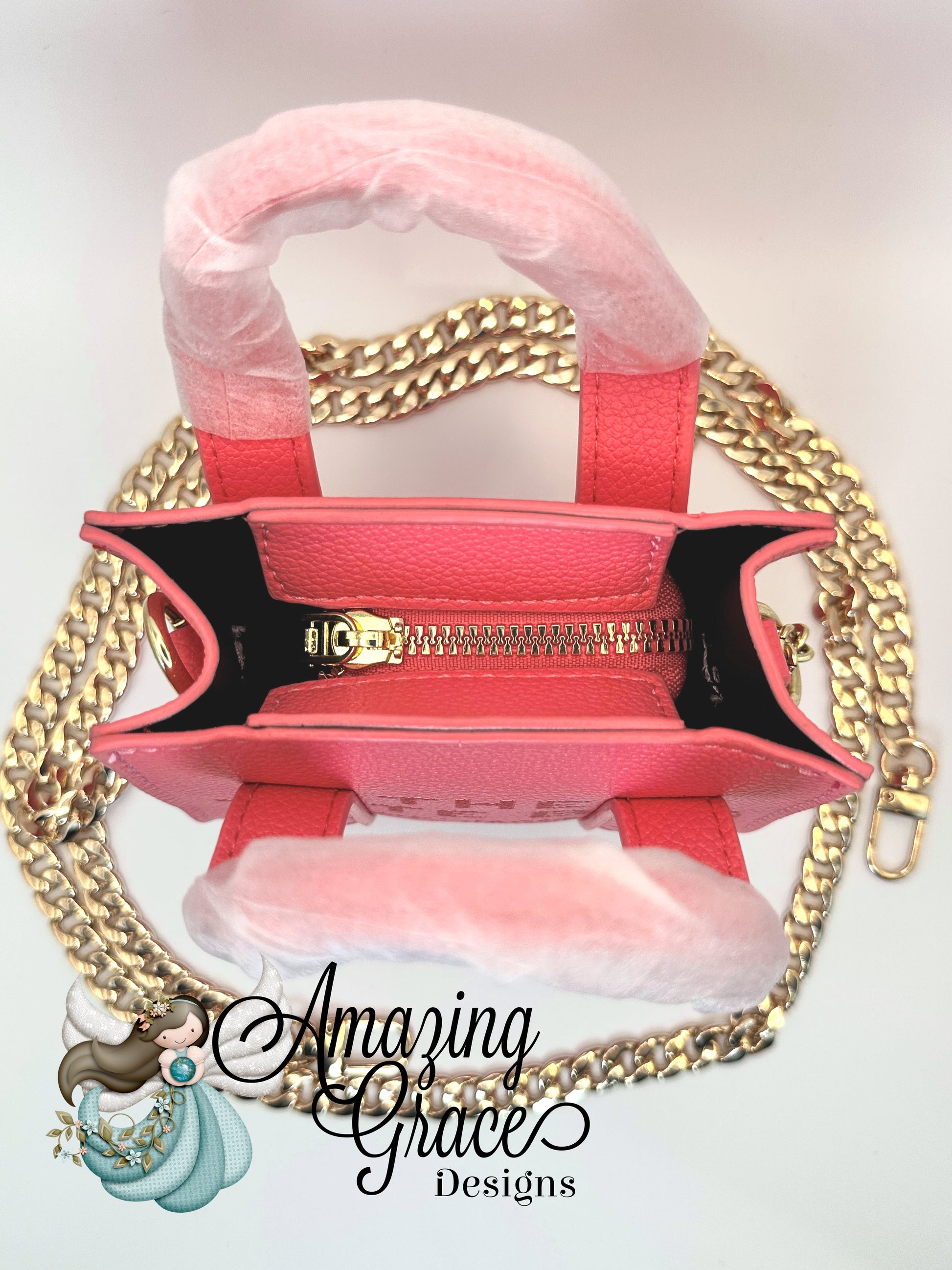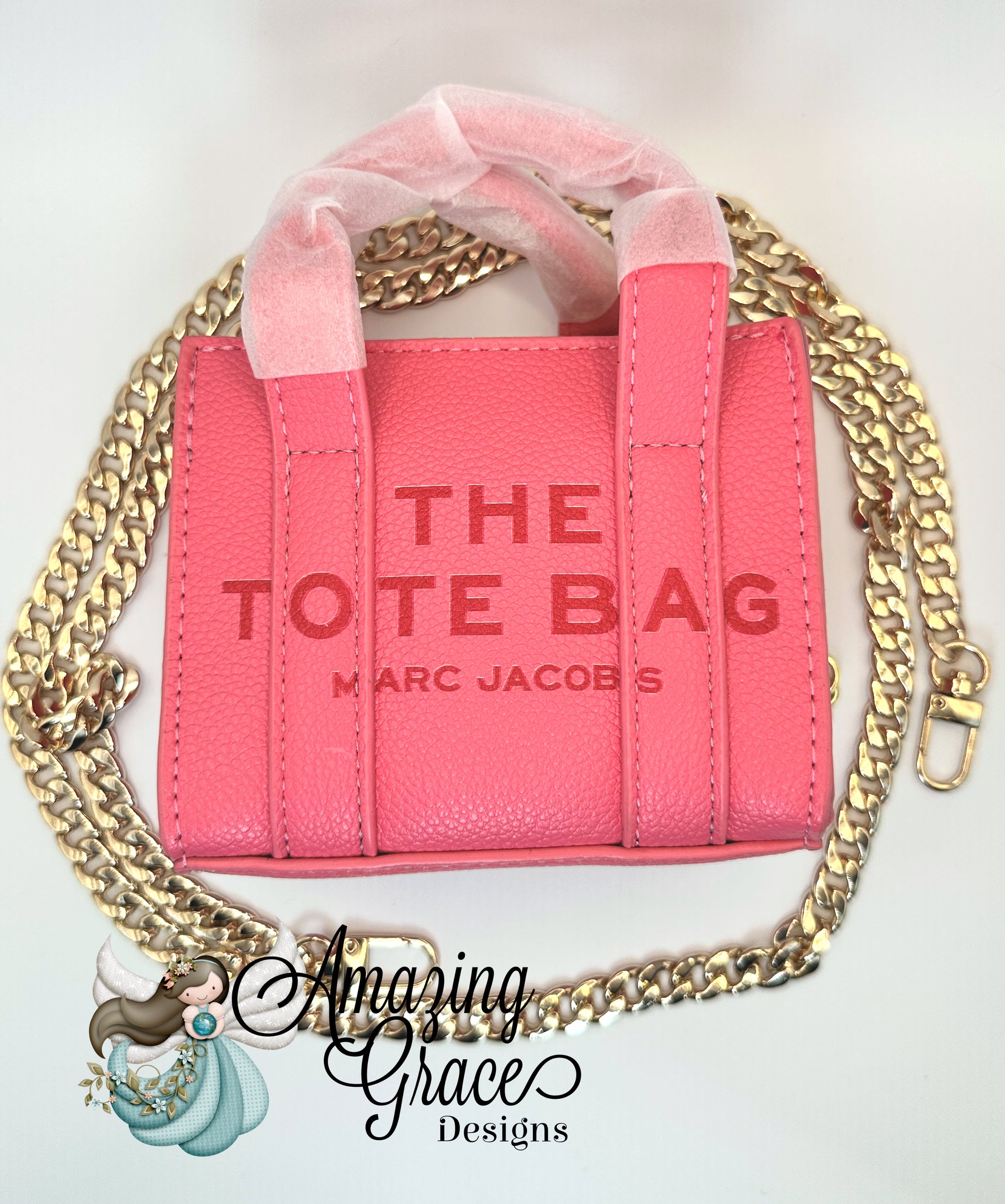 Make a bold statement with this eye-catching miniature tote bag. The beautiful pink faux leather adds a cheerful splash of color, perfect for brightening up any ensemble. This compact accessory features a secure top zipper to keep your small belongings organized and safe. The bag comes with a versatile, removable gold-tone chain strap, giving you the freedom to wear it as a crossbody or simply carry it by its top handles. This fun and fashionable bag is a must-have for those who love to express their personality through their style.