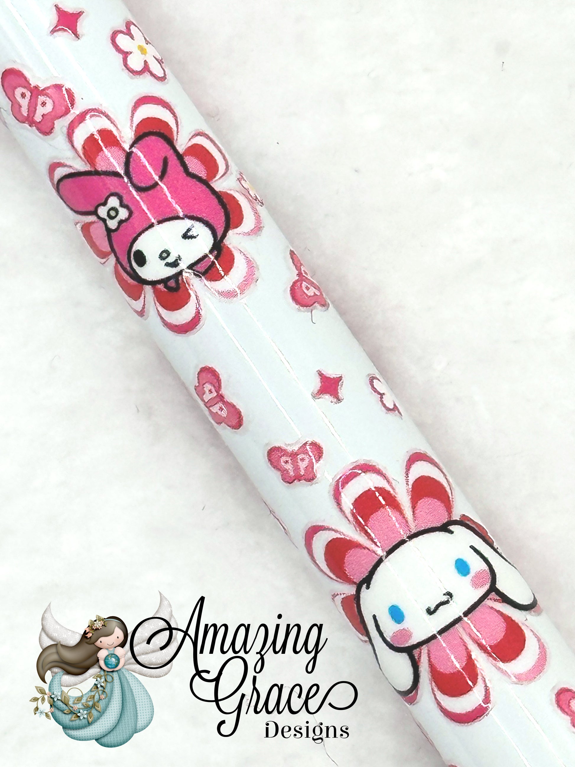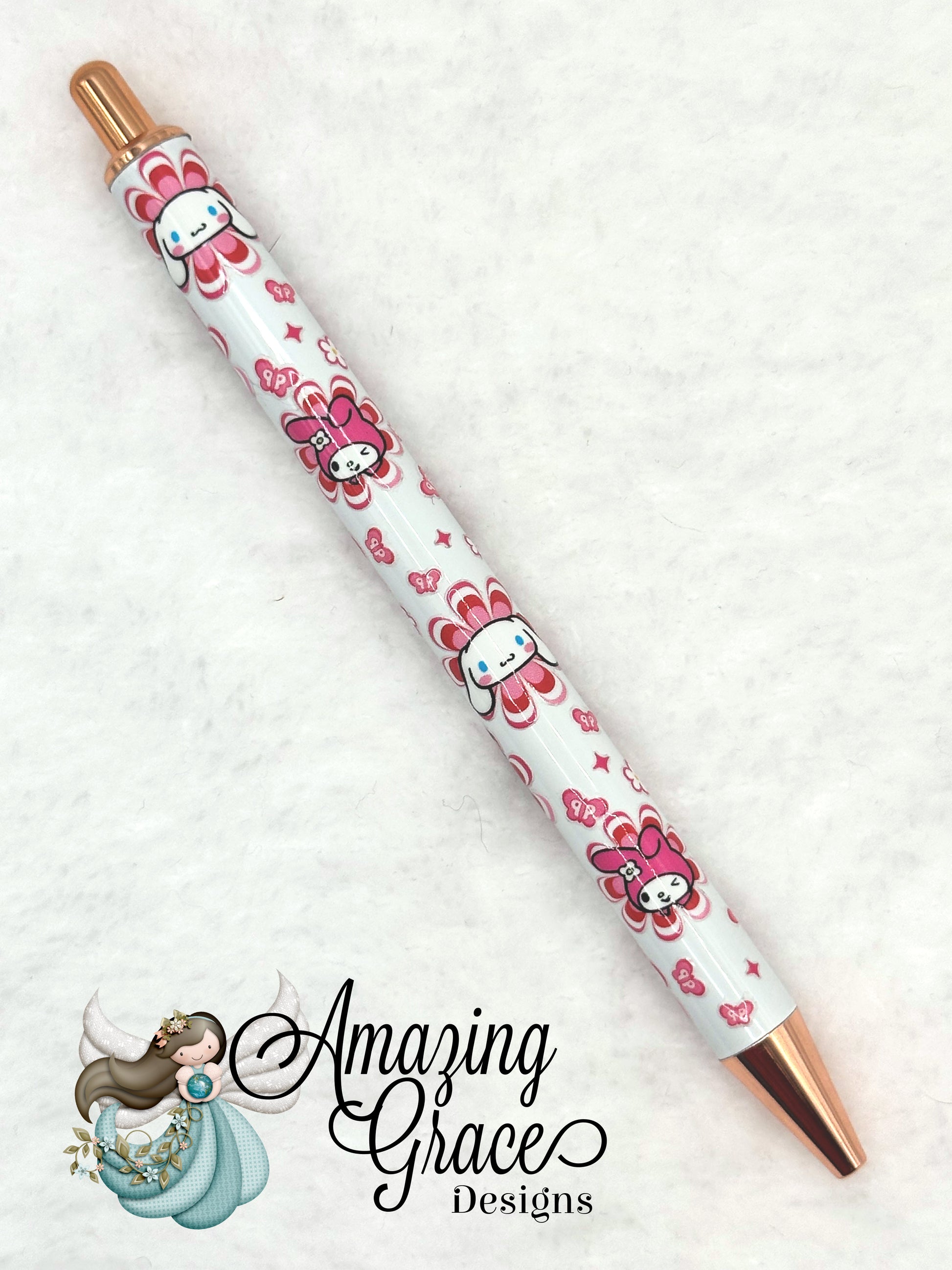 This delightful white pen features an enchanting pattern of various charming characters, each framed by vibrant red and pink floral designs. Small butterflies and stars are scattered throughout the pattern, and the pen is finished with elegant rose gold accents on both ends. It’s a cheerful addition to any writing collection or a thoughtful gift.