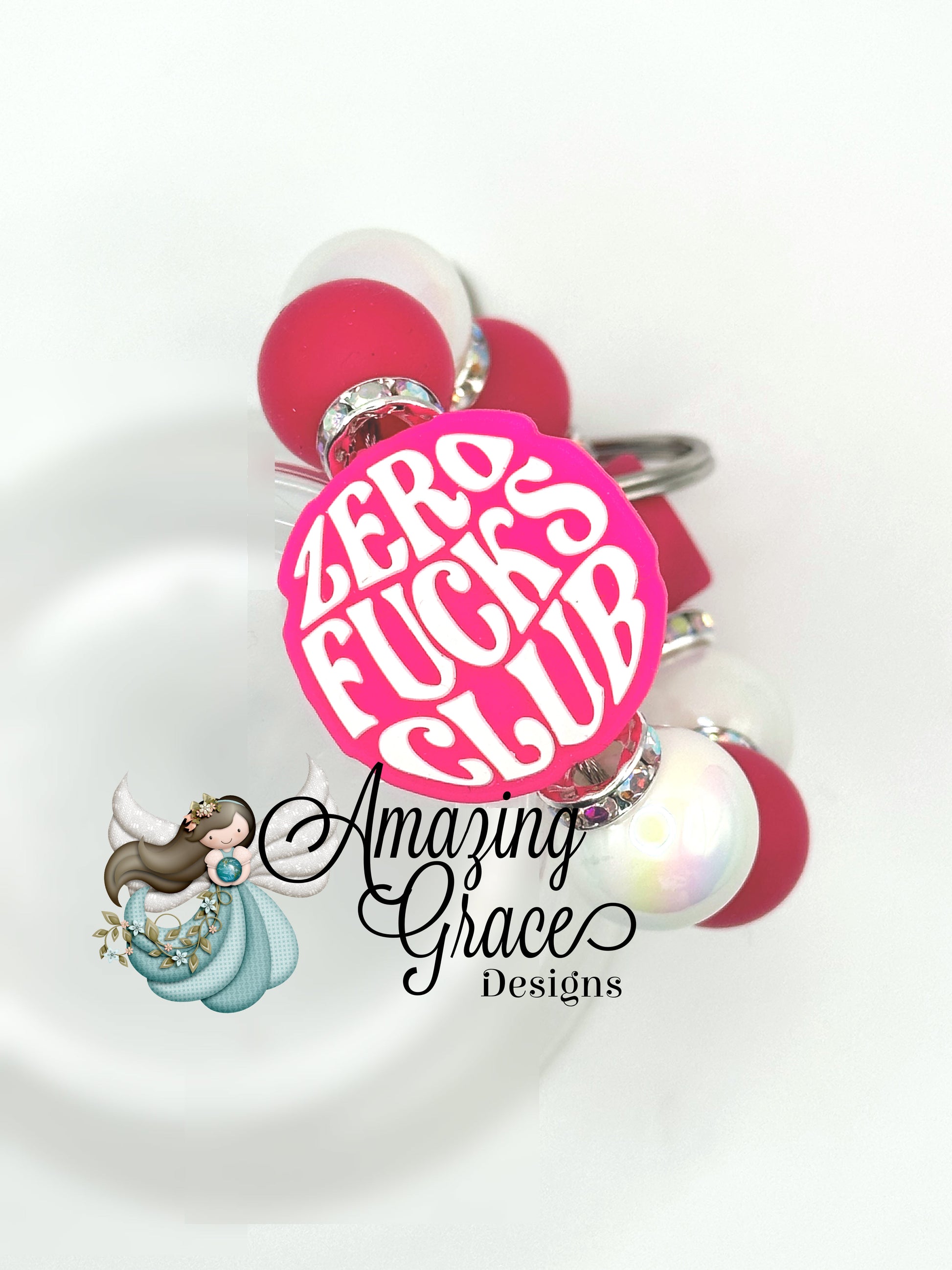 Declare your membership in the "Zero Fcks Club" with this bold and sassy mini keychain! It features vibrant hot pink and iridescent white beads accented with sparkling rhinestone spacers, all centered around a prominent "Zero Fcks Club" charm. Perfect for adding a dose of attitude to your keys or bag.